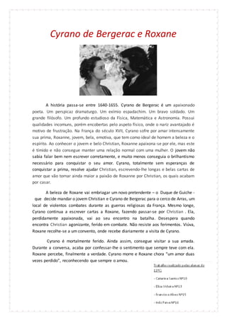 A história passa-se no século XVII na França e conta a história de Cyrano de Bergerac, um poeta e espadachim apaixonado por sua prima Roxane, que se apaixona pelo jovem Christian. Para ajudar Christian, Cyrano escreve cartas de amor em seu nome, o que leva Roxane e Christian a se casarem. Christian morre na guerra e Cyrano continua visitando a viúva Roxane, confessando seu amor por ela antes de também morrer, fazendo Roxane perceber que sempre amou Cyrano.