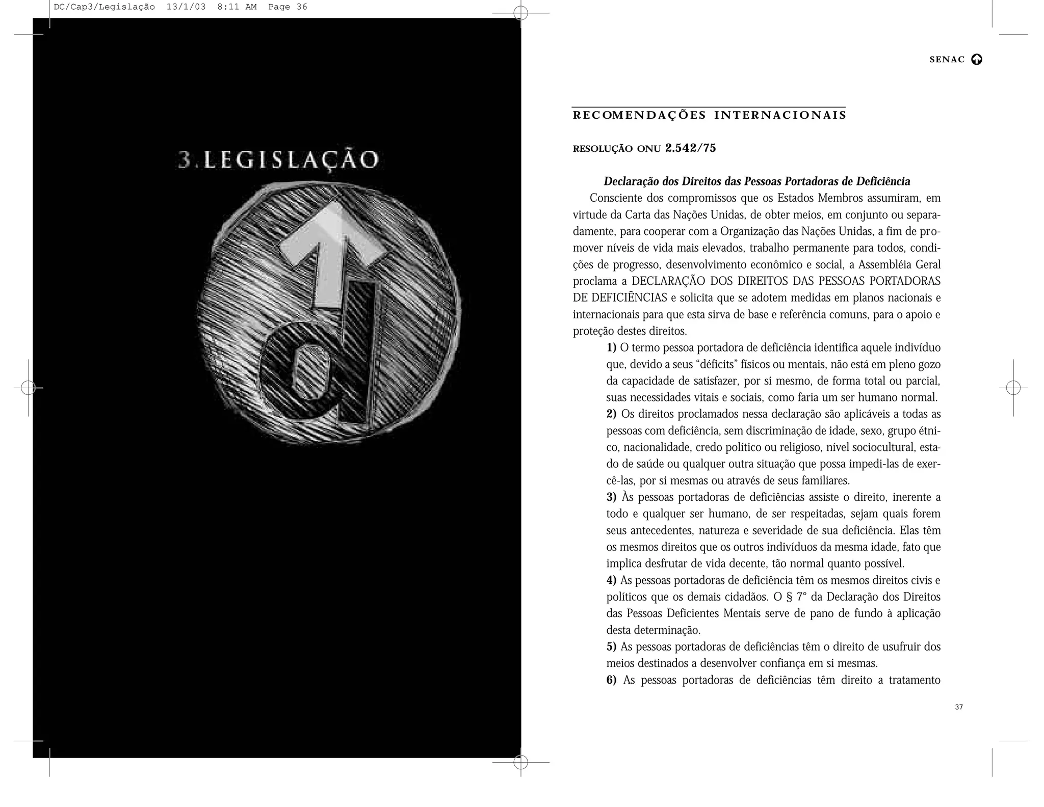 O documento discute direitos e recomendações internacionais relacionadas aos direitos das pessoas com deficiência, incluindo a Declaração dos Direitos das Pessoas com Deficiência da ONU de 1975 e convenções da Organização Internacional do Trabalho de 1963. Também resume leis brasileiras que tratam dos direitos e assistência às pessoas com deficiência.