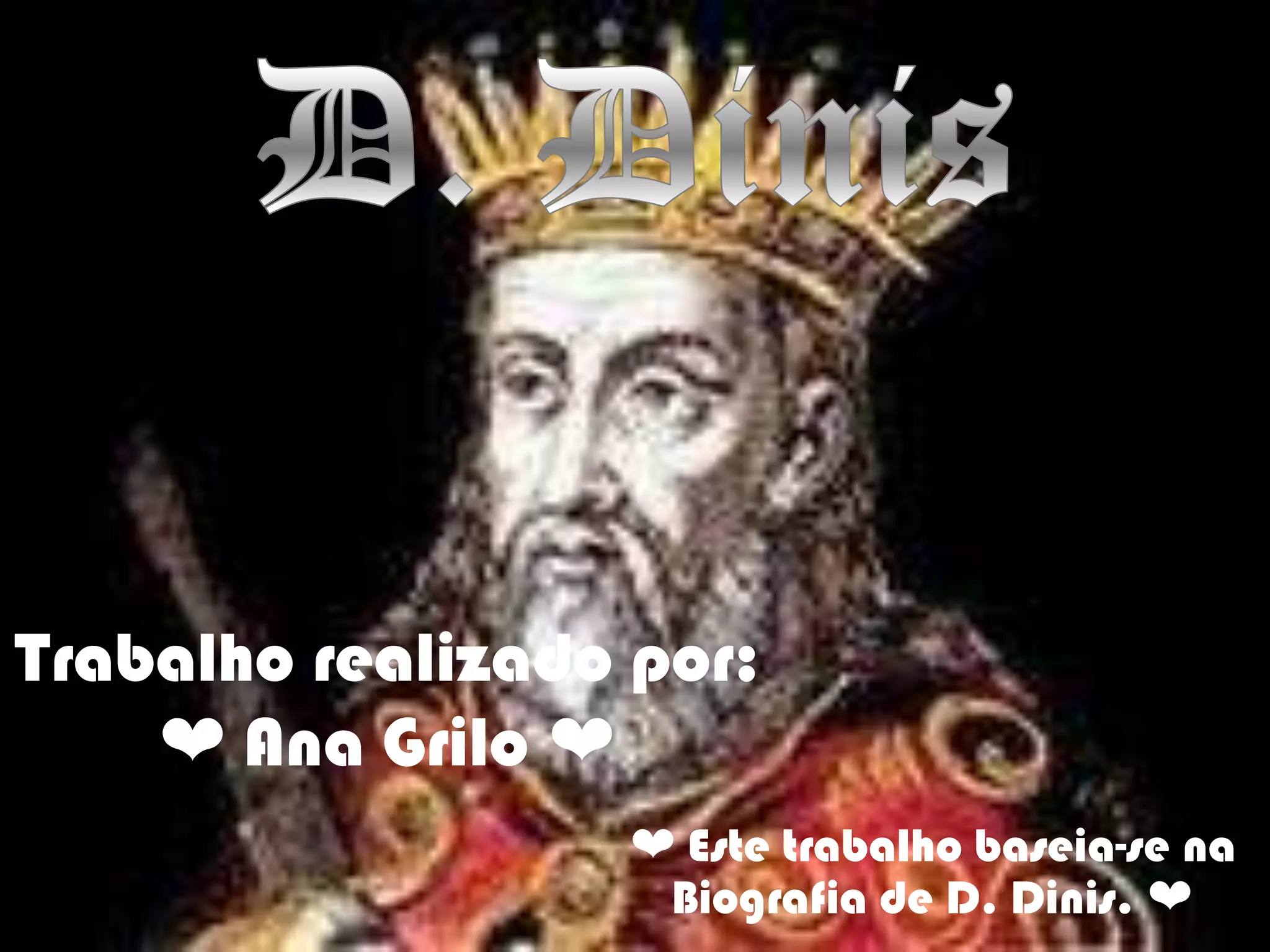 D. Dinis promoveu o comércio através de feiras francas, incentivou a agricultura e a ordem de Cristo. Foi um rei inovador que fundou a Universidade de Coimbra e mandou escrever documentos em português, embora tenha enfrentado oposição a algumas de suas ideias. Casou-se com Isabel de Aragão, conhecida como a "Rainha Santa".