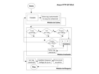 Este documento discute ataques de negação de serviço distribuídos (DDoS), definindo-os e descrevendo suas variantes, como ICMP, UDP e TCP flooding. Também aborda ferramentas e ataques realizados por grupos hacktivistas entre 2008-2012, focando em ataques DDoS HTTP e possíveis soluções de detecção e prevenção em sistemas Linux. Por fim, propõe um modelo para identificar e tratar especificamente ataques DDoS GET HTTP.