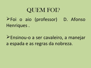 D. Egas Moniz viveu entre 1080 e 1127. Ele serviu como tutor e figura paterna para D. Afonso Henriques, ensinando-o habilidades de cavalaria. Foi sepultado na Igreja de Paço de Sousa.