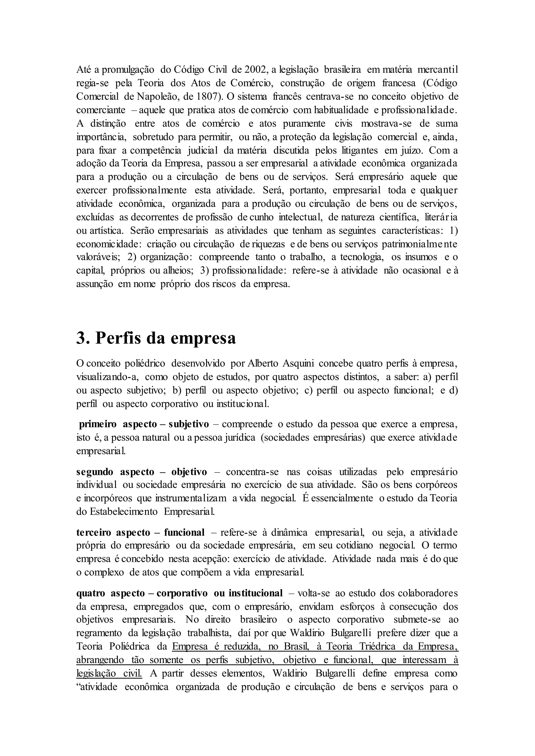 O documento descreve a evolução do conceito de empresa na legislação brasileira, passando da Teoria dos Atos de Comércio para a Teoria da Empresa no Código Civil de 2002. A empresa passou a ser definida como qualquer atividade econômica organizada para produção ou circulação de bens e serviços, e não apenas atos mercantis. O documento também apresenta os conceitos de estabelecimento empresarial, matrizes, filiais, trespasse e aviamento.
