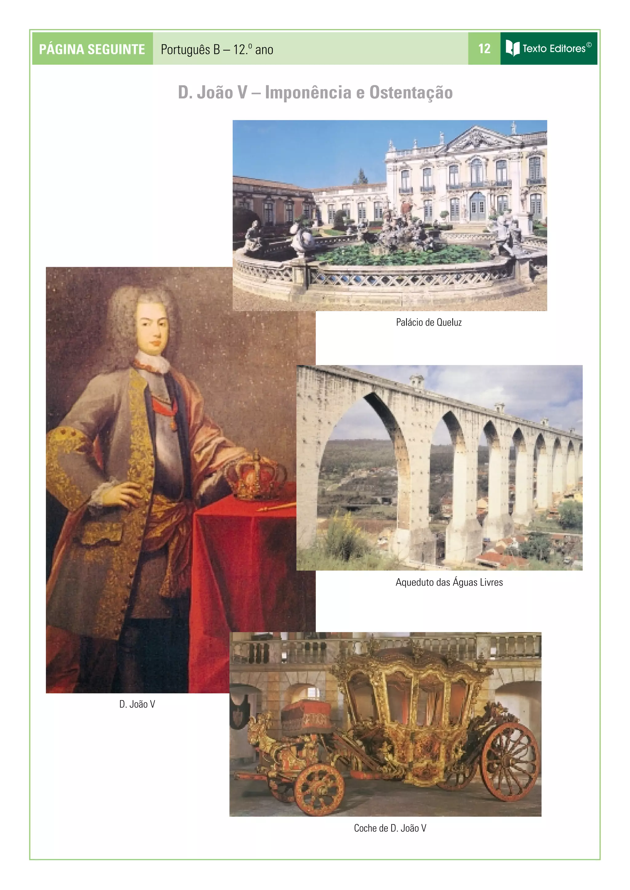 D. João V foi um rei português do século 18 conhecido por sua imponência e ostentação, construindo o Palácio de Queluz e o Aqueduto das Águas Livres, e vivendo uma vida de luxo como evidenciado por seu luxuoso coche.