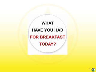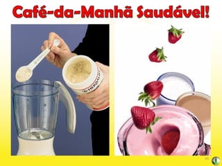 O documento discute a importância de um café da manhã equilibrado e como a Herbalife oferece opções saudáveis para essa refeição, como shakes proteicos. Também promove um evento de café da manhã para apresentar essas opções e discute os benefícios de se tornar um distribuidor da Herbalife.
