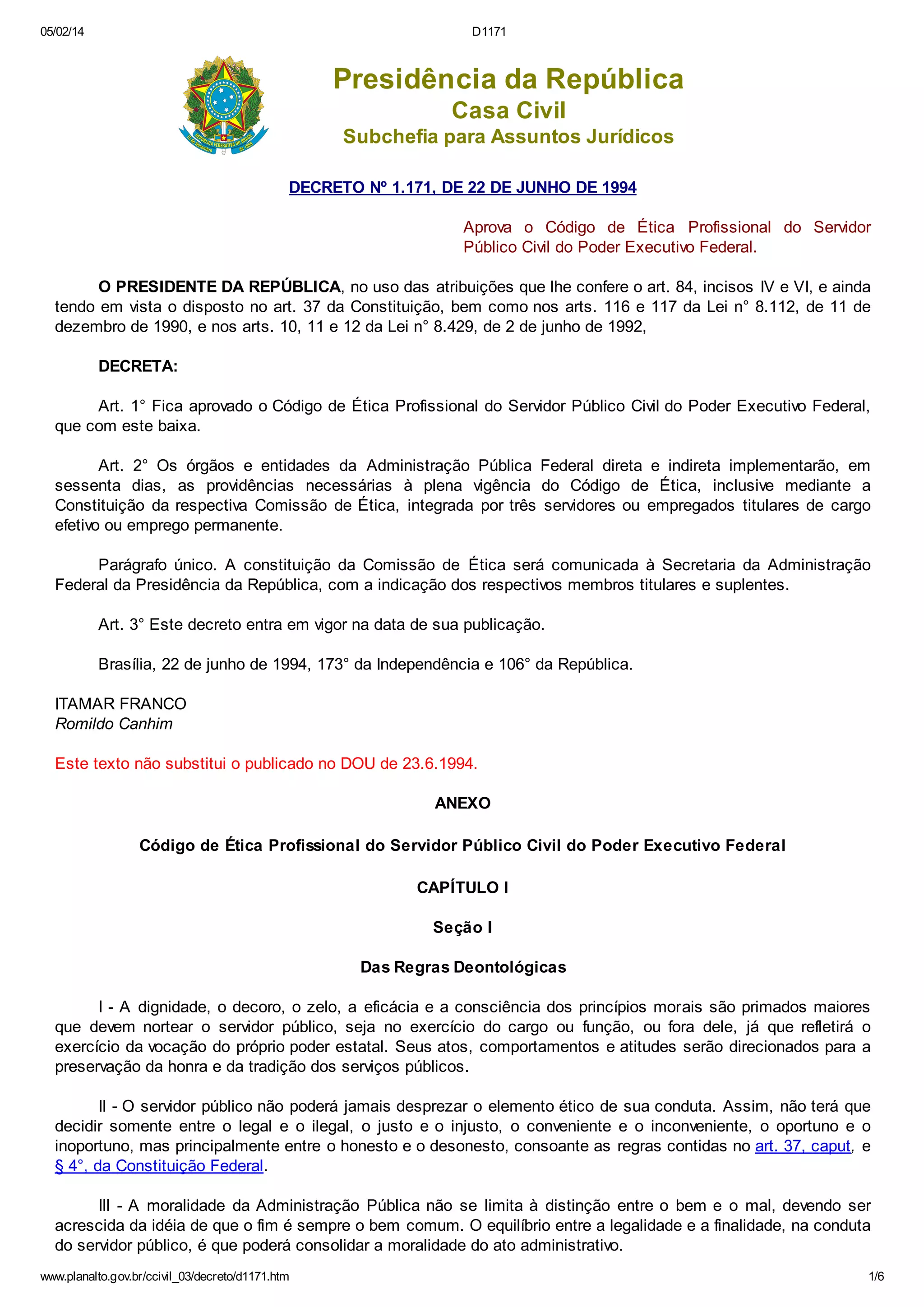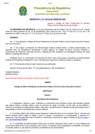 Este documento aprova o Código de Ética Profissional do Servidor Público Civil do Poder Executivo Federal. O código estabelece regras de conduta ética para servidores públicos, incluindo deveres como tratar os cidadãos com cortesia, zelar pelo interesse público e abster-se de usar o cargo para obter favorecimentos. Também proíbe servidores de usar seu cargo para benefício próprio ou prejudicar a reputação de outros.