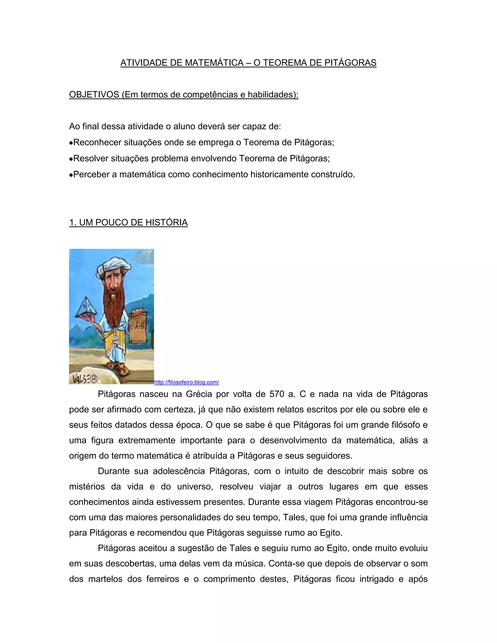 O documento descreve uma atividade sobre o Teorema de Pitágoras, começando com uma breve história sobre Pitágoras e sua descoberta do teorema. Em seguida, explica como construir a demonstração geométrica do teorema e fornece um exemplo de sua aplicação para resolver um problema.