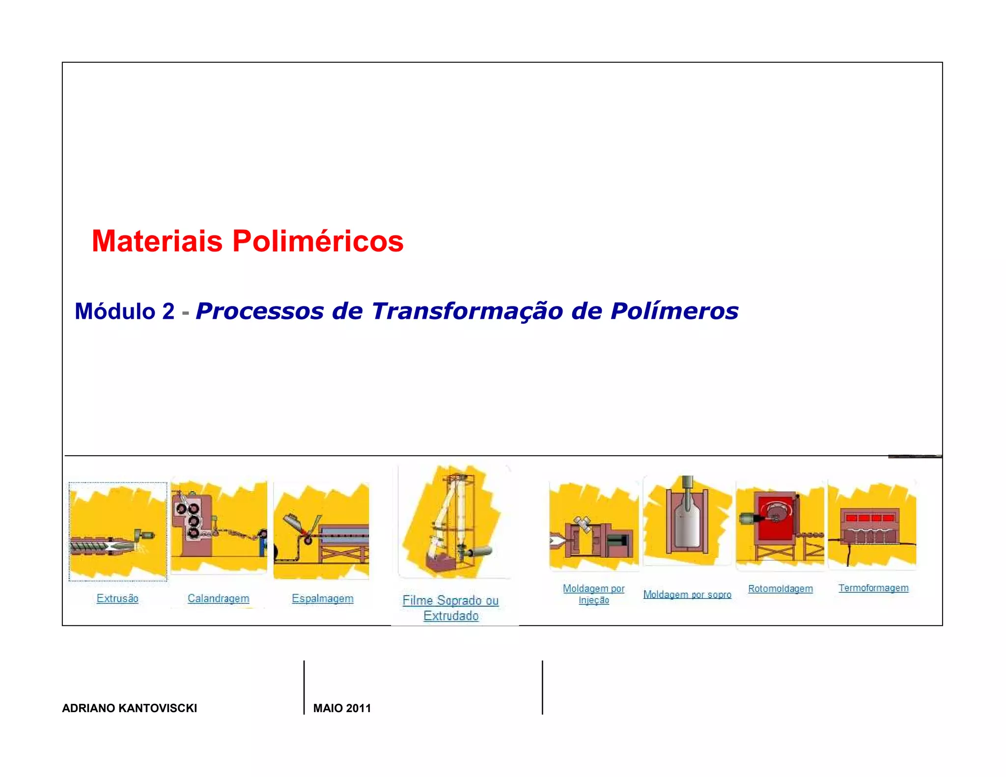 O documento descreve os principais processos de transformação de polímeros, incluindo extrusão, sopro, injeção, termoformagem, calandragem, rotomoldagem, compressão, fundição e operações secundárias como usinagem e colagem. É fornecido detalhes técnicos sobre cada processo como aplicações, equipamentos envolvidos e exemplos ilustrativos.