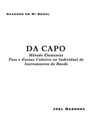 O documento apresenta um método para ensino de saxofone em Mi bemol, com 128 páginas contendo exercícios, músicas e instruções sobre o instrumento. As páginas incluem informações sobre a história do instrumento, quadros com símbolos musicais, exercícios graduais, partituras de canções e exercícios rítmicos e melódicos. Há também uma lista alfabética com o nome e página de cada música apresentada no método.