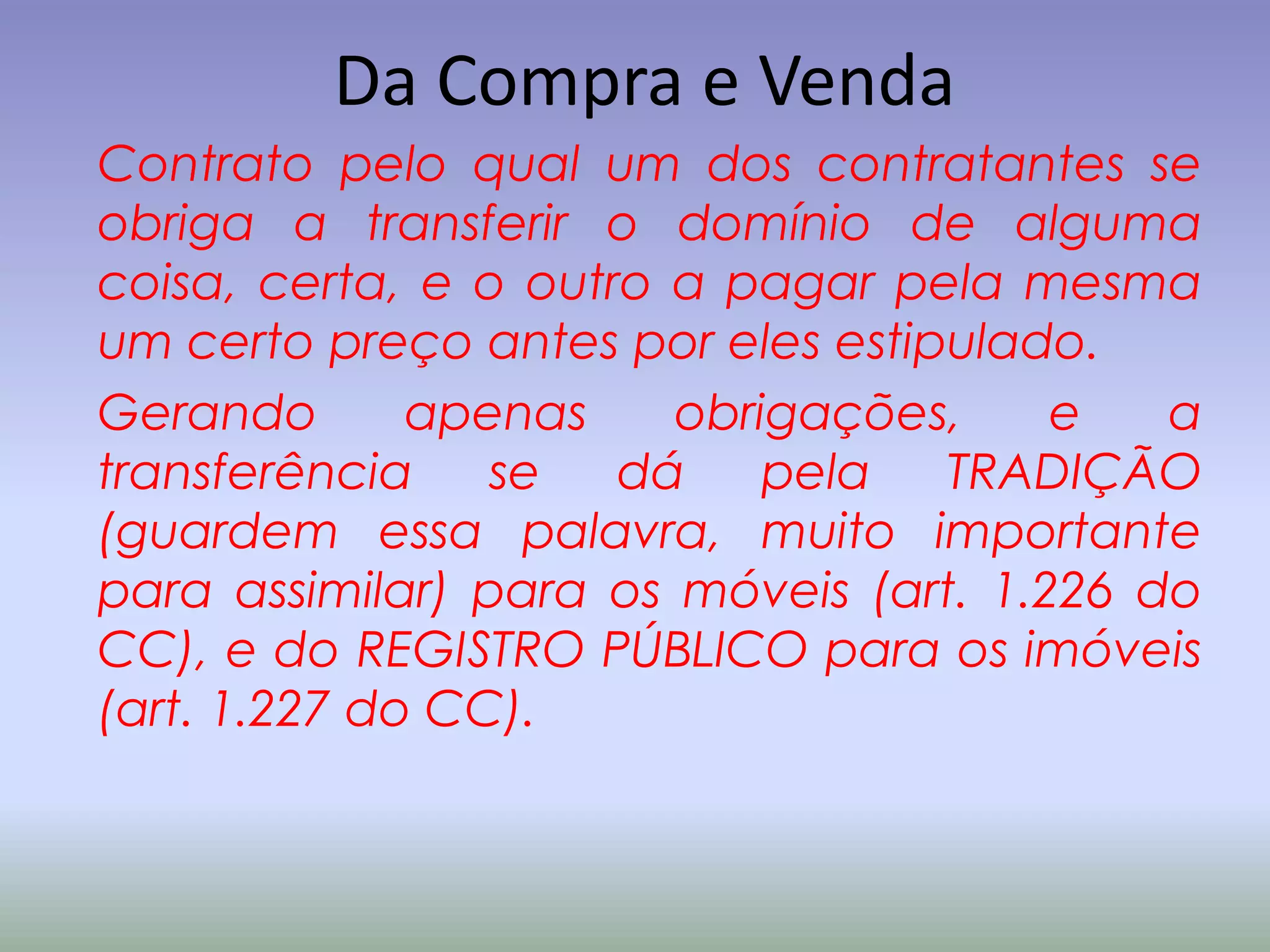 Este documento resume os principais aspectos jurídicos da compra e venda no direito civil brasileiro, incluindo sua natureza, elementos constitutivos, efeitos e limitações. Aborda também cláusulas especiais como retrovenda, venda a contento e preempção.