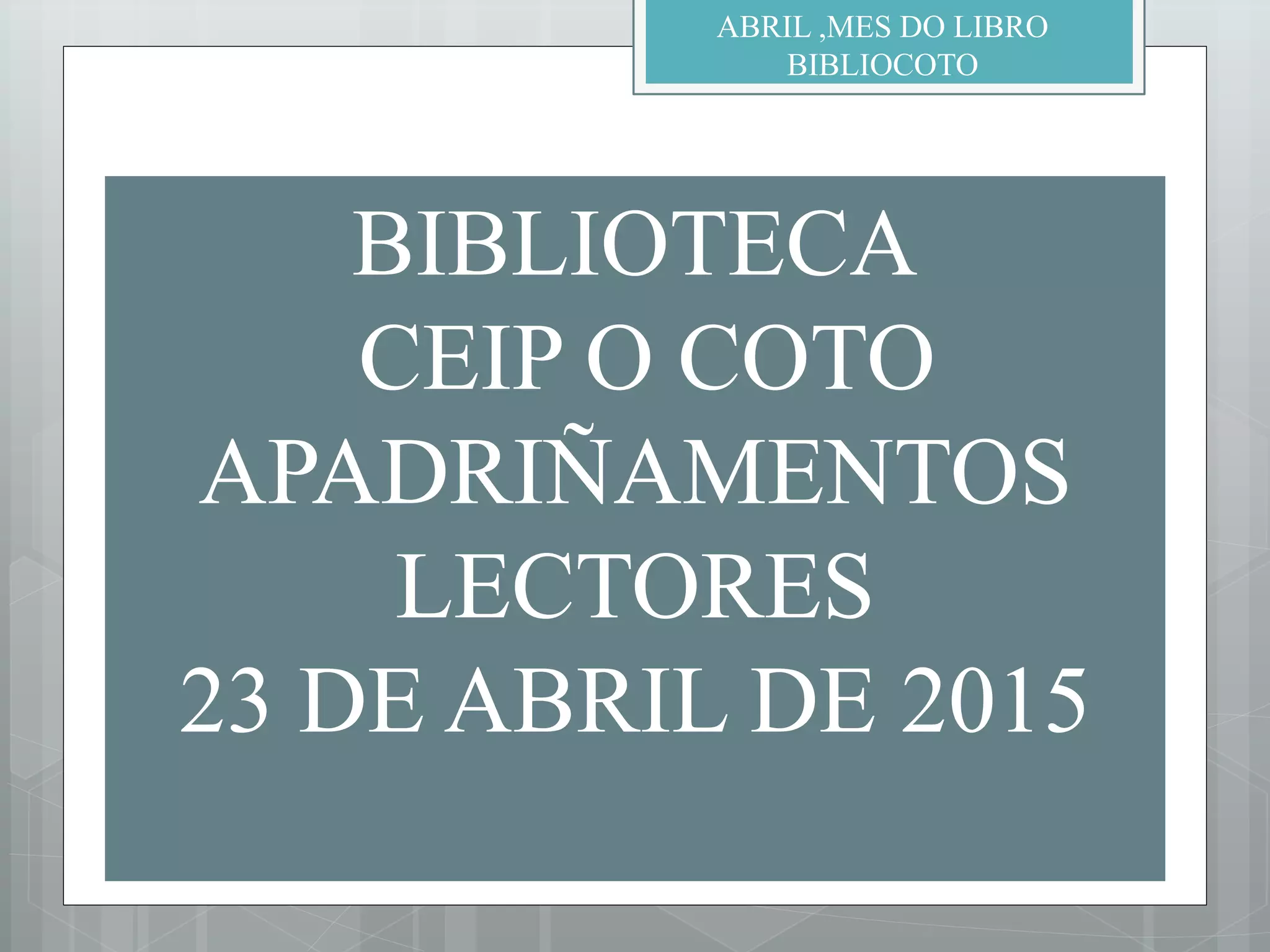 O documento é um relatório de uma biblioteca escolar sobre o mês de abril, mês do livro. Ele descreve como a biblioteca realizou atividades de apadrinhamento de leitores e comemorações do mês do livro. Os alunos e funcionários pareciam ter apreciado as atividades dedicadas a promover a leitura.