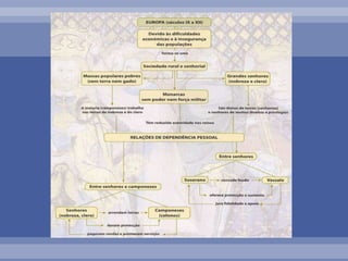 1) O documento descreve a sociedade feudal na Idade Média, com a divisão em ordens estamentais, a organização dos feudos e as obrigações impostas aos camponeses.