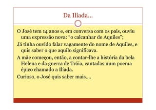 O documento discute as dificuldades que José, um jovem de 14 anos, enfrenta ao tentar encontrar informações sobre a Ilíada na internet. Embora encontre muitos resultados, a maioria não é adequada ou acessível para sua idade. Bibliotecas aparecem raramente em suas buscas online.