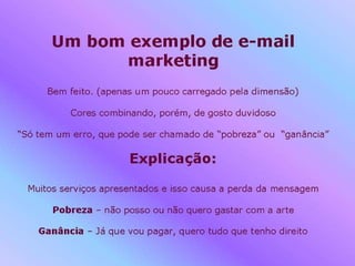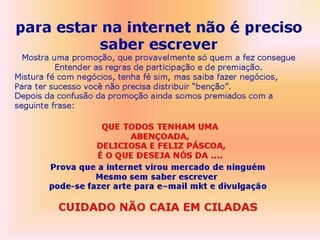 1) O documento discute os erros gramaticais e de conteúdo encontrados em anúncios de marketing digital de empresas.