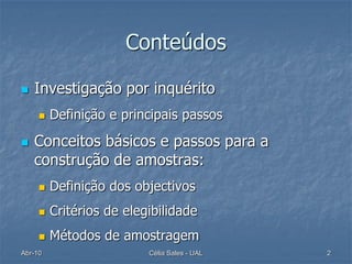 Este documento discute os conceitos e passos fundamentais da investigação por inquérito e amostragem. Primeiro, define investigação por inquérito e seus principais passos. Em seguida, explica os conceitos de objetivos, critérios de elegibilidade e métodos de amostragem, incluindo amostras probabilísticas e não probabilísticas. Por fim, descreve os tipos de desenhos metodológicos e os passos para construir uma amostra representativa.