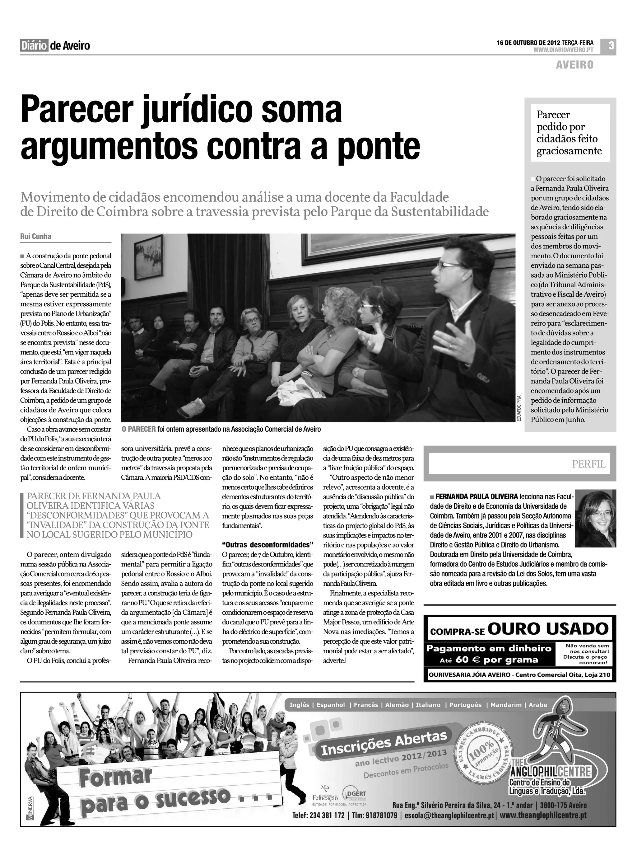Um parecer jurídico encomendado por cidadãos de Aveiro conclui que: (1) A construção da ponte pedonal proposta pela Câmara de Aveiro para o Parque da Sustentabilidade não está prevista no Plano de Urbanização da área; (2) Sua execução sem constar do Plano de Urbanização seria ilegal; (3) Há outras "desconformidades" como a ocupação do espaço reservado para o elétrico de superfície e a ausência de discussão pública sobre o projeto.