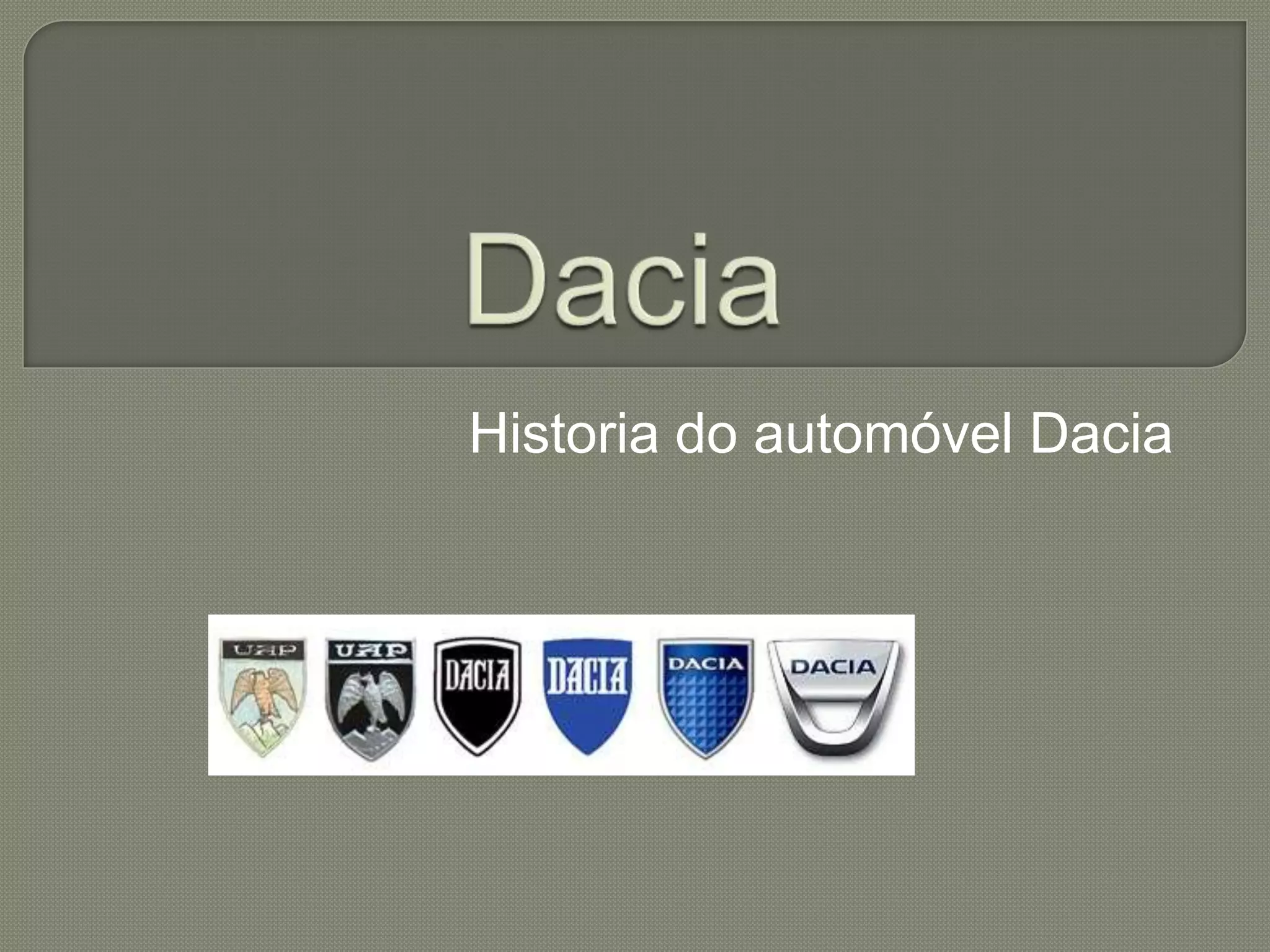 O documento resume a história do automóvel Dacia desde sua fundação na Romênia em 1966 até os anos 1990. Inicialmente, a Dacia produziu modelos sob licença da Renault, como o Dacia 1100, antes de lançar seu primeiro modelo original, o Dacia 1300, em 1969. Nos anos seguintes, a Dacia lançou várias variantes do 1300 e também modelos como o Dacia 1310, 1410 e 2000. A empresa passou por diversos processos de atualização de sua linha ao longo das décadas até lançar o novo modelo Dacia Nova