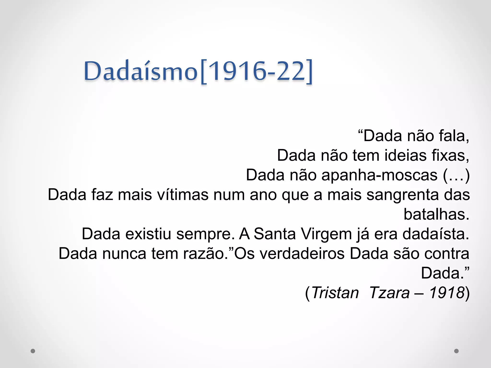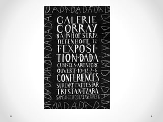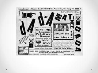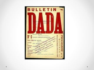O documento resume o movimento artístico dadaísta que surgiu em 1916 na cidade neutra de Zurique durante a Primeira Guerra Mundial. O dadaísmo rejeitava tradições sociais e artísticas através do niilismo e da destruição como forma de criação. Artistas como Marcel Duchamp, Tristan Tzara e Hans Arp usavam o absurdo e a anti-arte para chocar o público e libertar a imaginação.