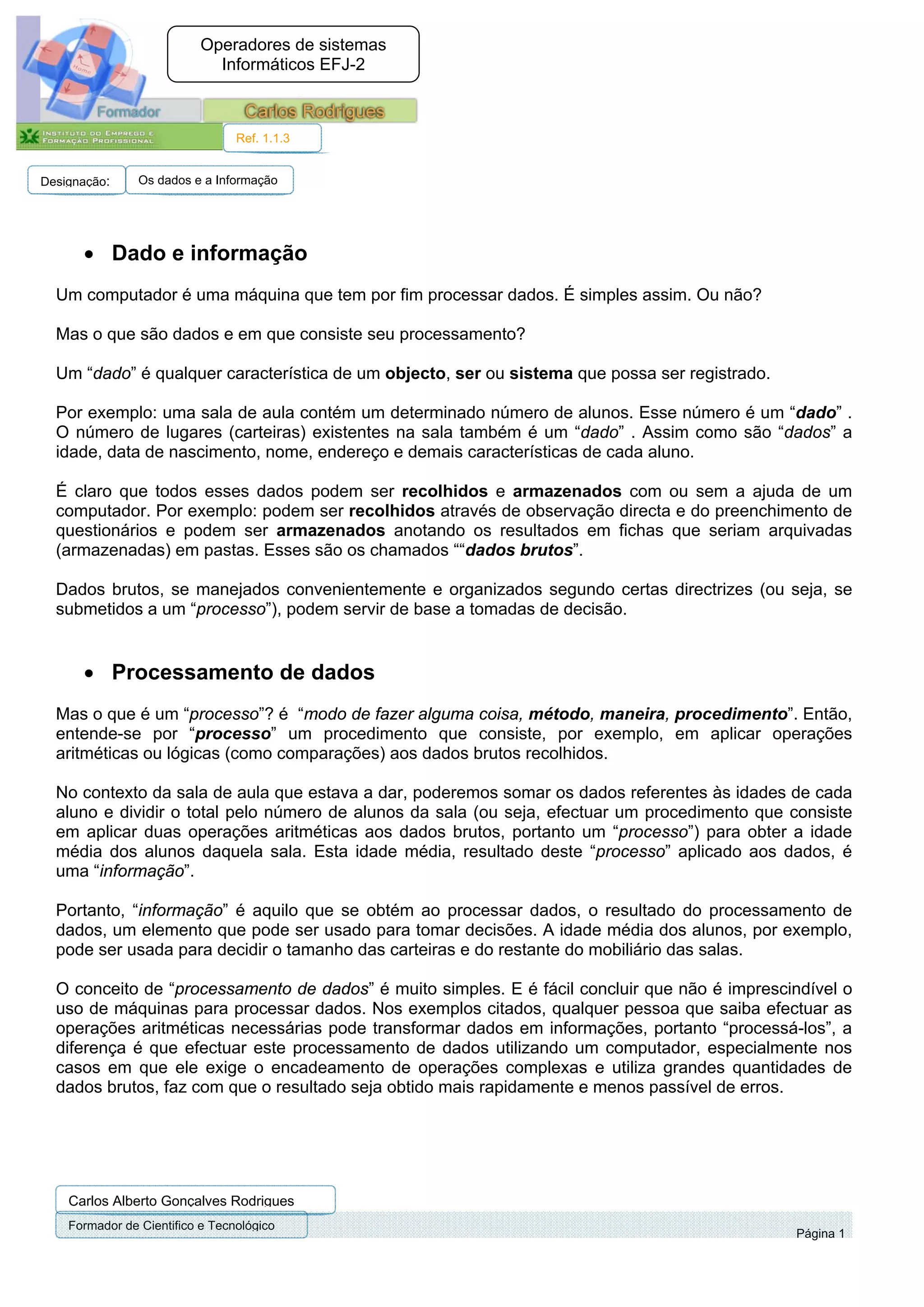 1) Dados são características de objetos que podem ser registrados, e informação é o resultado do processamento de dados, que pode ser usado para tomar decisões.