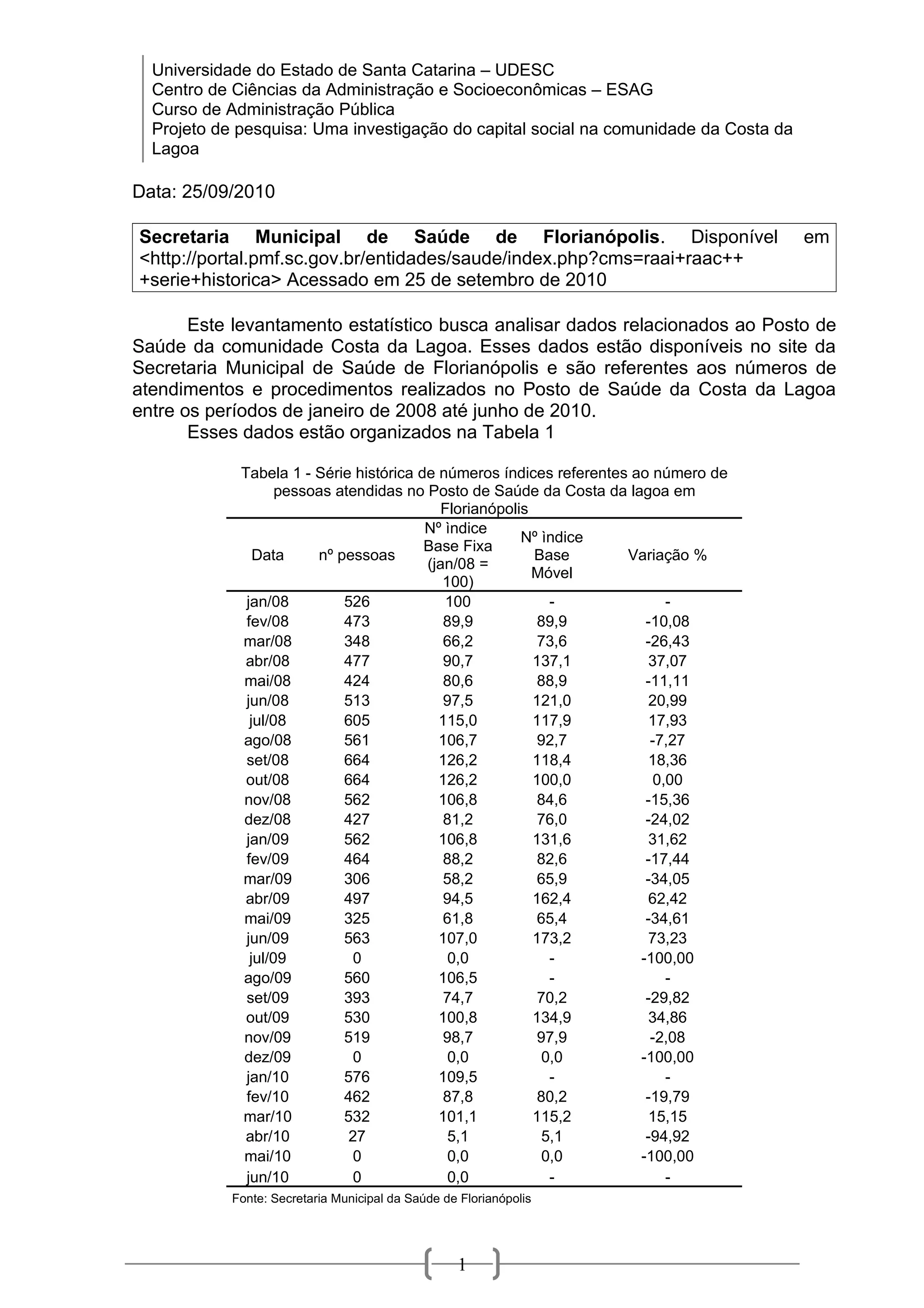 Este documento resume um projeto de pesquisa da Universidade do Estado de Santa Catarina sobre o capital social na comunidade da Costa da Lagoa. Ele analisa dados estatísticos do posto de saúde local entre 2008-2010, mostrando que o número de atendimentos foi em média 500 por mês, com algumas limitações nos dados. O estudo sugere entrevistar moradores para entender a percepção sobre o posto de saúde e participação municipal.