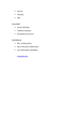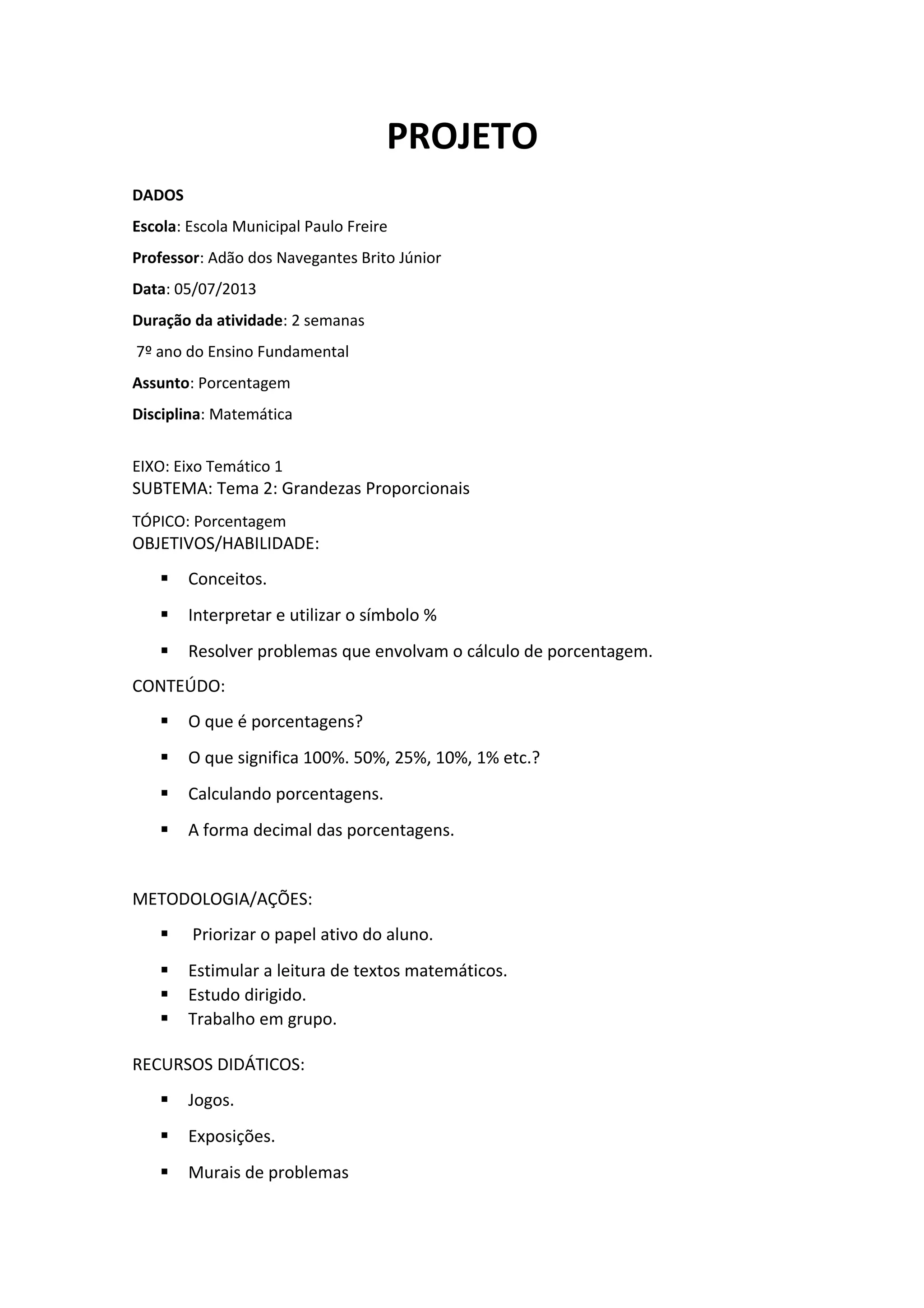 O documento descreve um projeto de duas semanas sobre porcentagem para alunos do 7o ano do ensino fundamental. O projeto abordará conceitos básicos de porcentagem, cálculo de porcentagens e representação decimal de porcentagens. As atividades incluirão jogos, grupos, pesquisas na internet e avaliações individuais e em grupo.