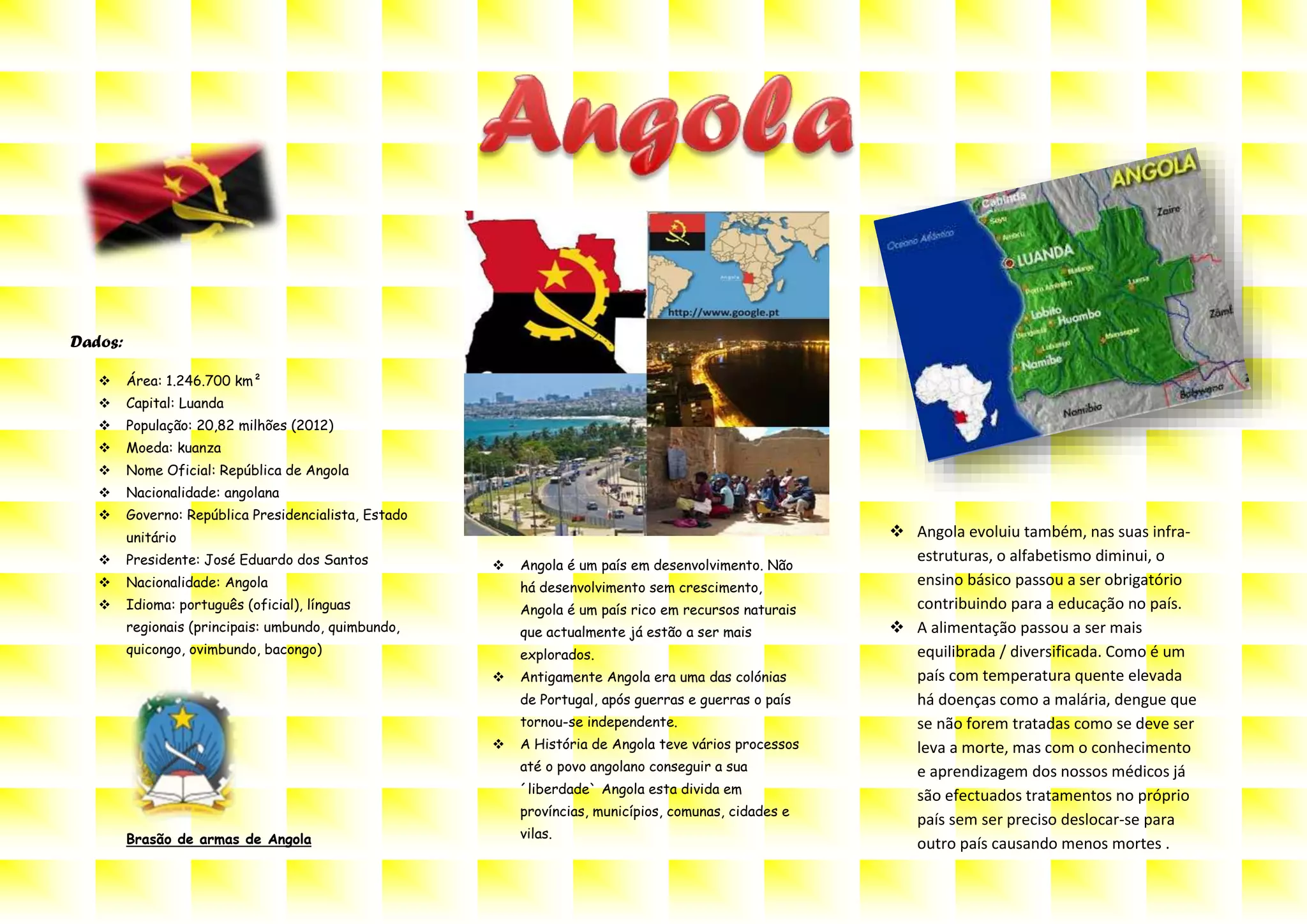 Angola, com uma área de 1.246.700 km² e população de 20,82 milhões, é uma república presidencialista em desenvolvimento, rica em recursos naturais. Após conquistar a independência de Portugal, o país tem progredido em educação e infraestruturas, embora enfrente desafios de saúde como malária e dengue. Apesar das melhorias, Angola ainda precisa aprender e evoluir em várias áreas para garantir um desenvolvimento sustentável.