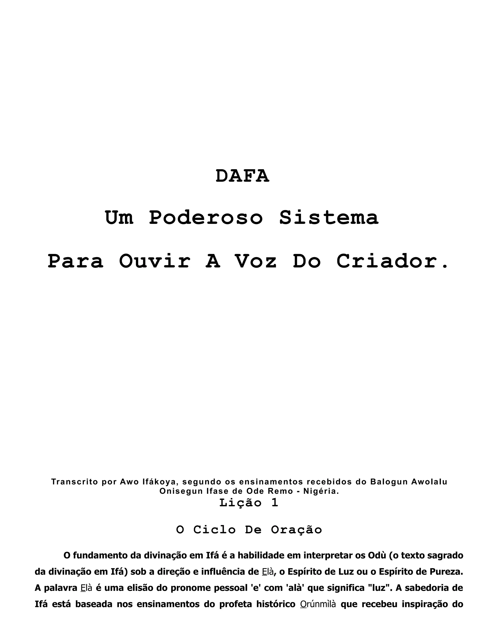 Este documento apresenta os fundamentos da divinação Ifá e o ciclo de oração diário e de quatro dias. Em 3 frases: