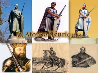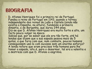 D. Afonso Henriques foi o primeiro rei de Portugal, declarando independência de Leão e Castela em 1143 e fundando a dinastia de Borgonha. Era conhecido por sua força e bravura na batalha, com lendas de que sua espada pesava mais de 5 quilos. Após vitórias como a Batalha de S. Mamede e Ourique, o Papa confirmou Portugal como reino independente, deixando um território definido a seu filho D. Sancho I.