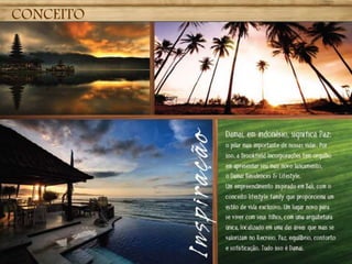 O documento descreve um empreendimento imobiliário com apartamentos de 4 suítes localizado em uma região praiana. O projeto conta com arquitetura, paisagismo e interiores premiados, além de diversas opções de lazer como piscinas e espaços gourmet. Os apartamentos possuem diferentes layouts e acabamentos de luxo, com destaque para as coberturas com conceito up house.