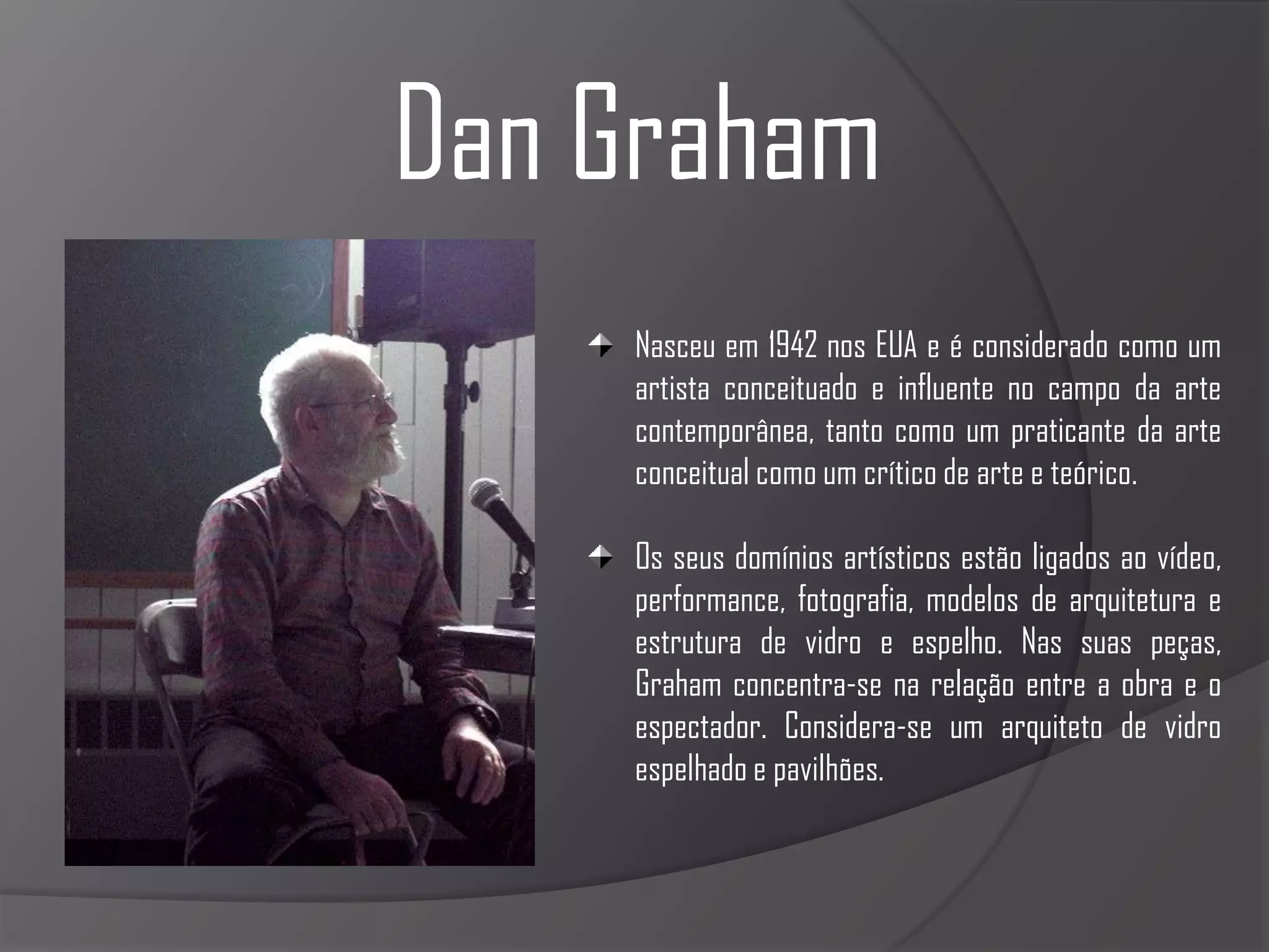 Dan Graham é um artista conceitual americano nascido em 1942 que trabalha principalmente com fotografia, vídeo, performance e arquitetura de vidro espelhado. Ele é conhecido por explorar a relação entre a obra de arte e o espectador. Ao longo de sua carreira, Graham examinou como a arquitetura afeta o comportamento e como o público interage com sua arte.
