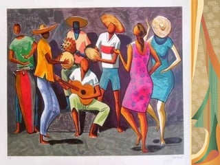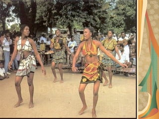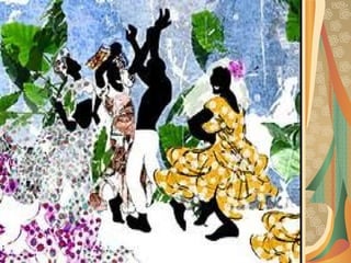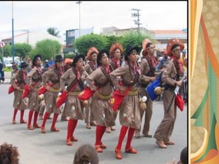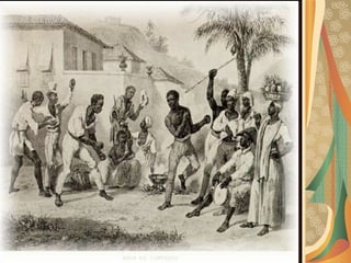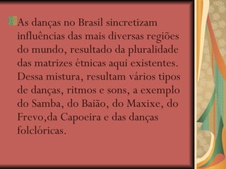 O documento descreve vários tipos de danças tradicionais brasileiras, incluindo o samba, capoeira, forró, frevo, maxixe, moçambique, xaxado, congo e suas origens. O samba surgiu no Rio de Janeiro a partir de danças africanas trazidas por escravos da Bahia e incorporou influências de outros ritmos. A capoeira começou como uma dança disfarçada de luta usada por escravos para resistir à opressão.