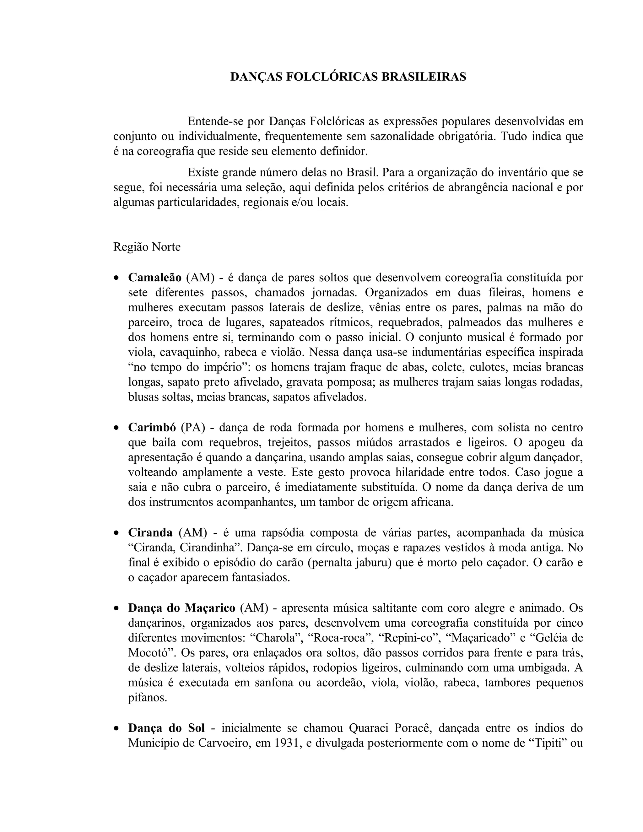 O documento fornece uma lista e descrição de várias danças folclóricas brasileiras, organizadas por região. É descrito o estilo, os passos, os trajes e os instrumentos musicais típicos de danças como o Camaleão, o Carimbó e a Ciranda na Região Norte, e o Cavalo Piancó, a Ciranda e o Coco na Região Nordeste.