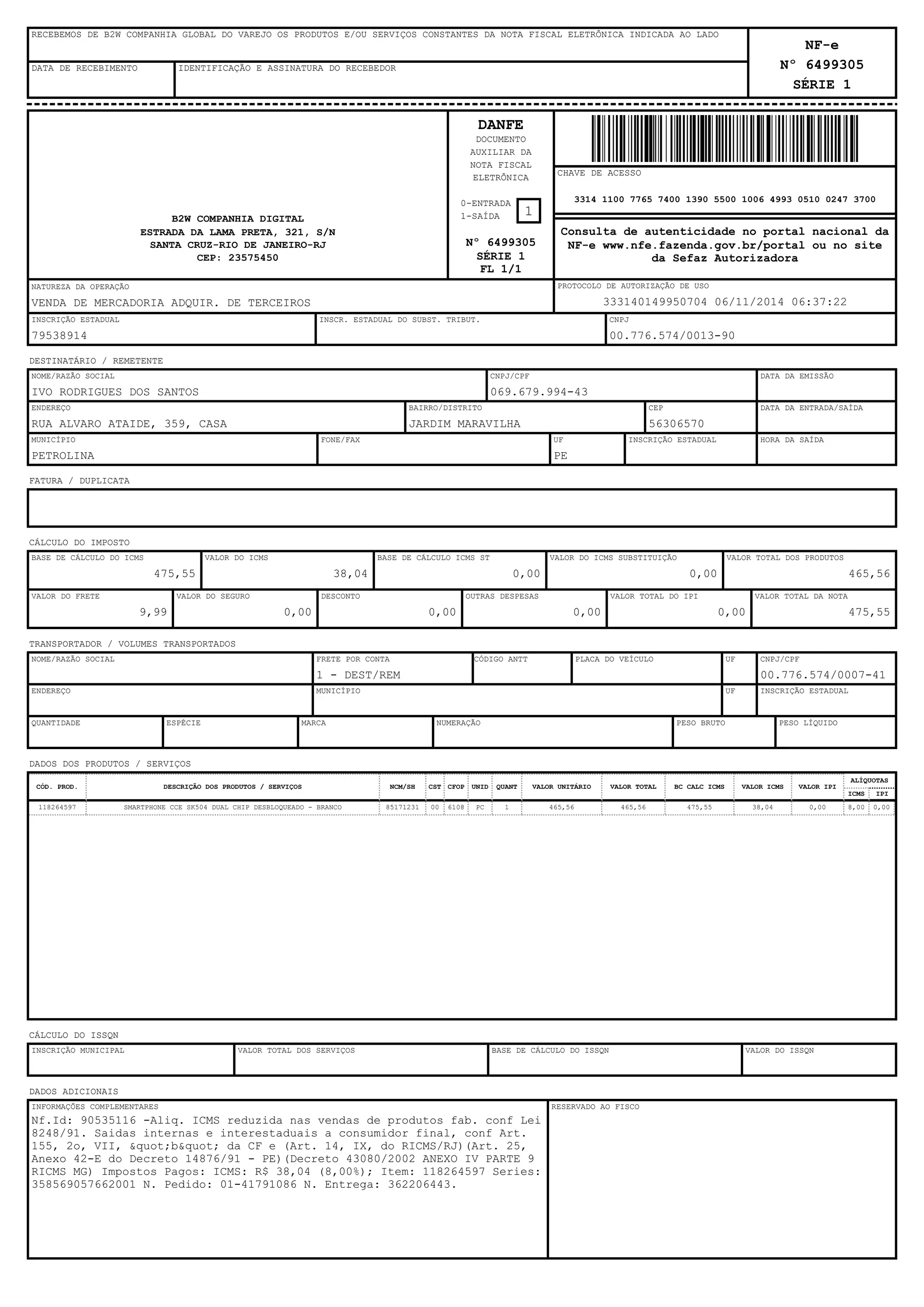 Este documento é uma nota fiscal eletrônica (NF-e) que registra a venda de um smartphone da marca B2W da Companhia Digital para Ivo Rodrigues dos Santos no valor total de R$475,55, incluindo R$465,56 pelo produto e R$9,99 de frete. A NF-e contém detalhes do produto, preços, impostos, datas e outras informações relevantes para o registro da transação comercial.