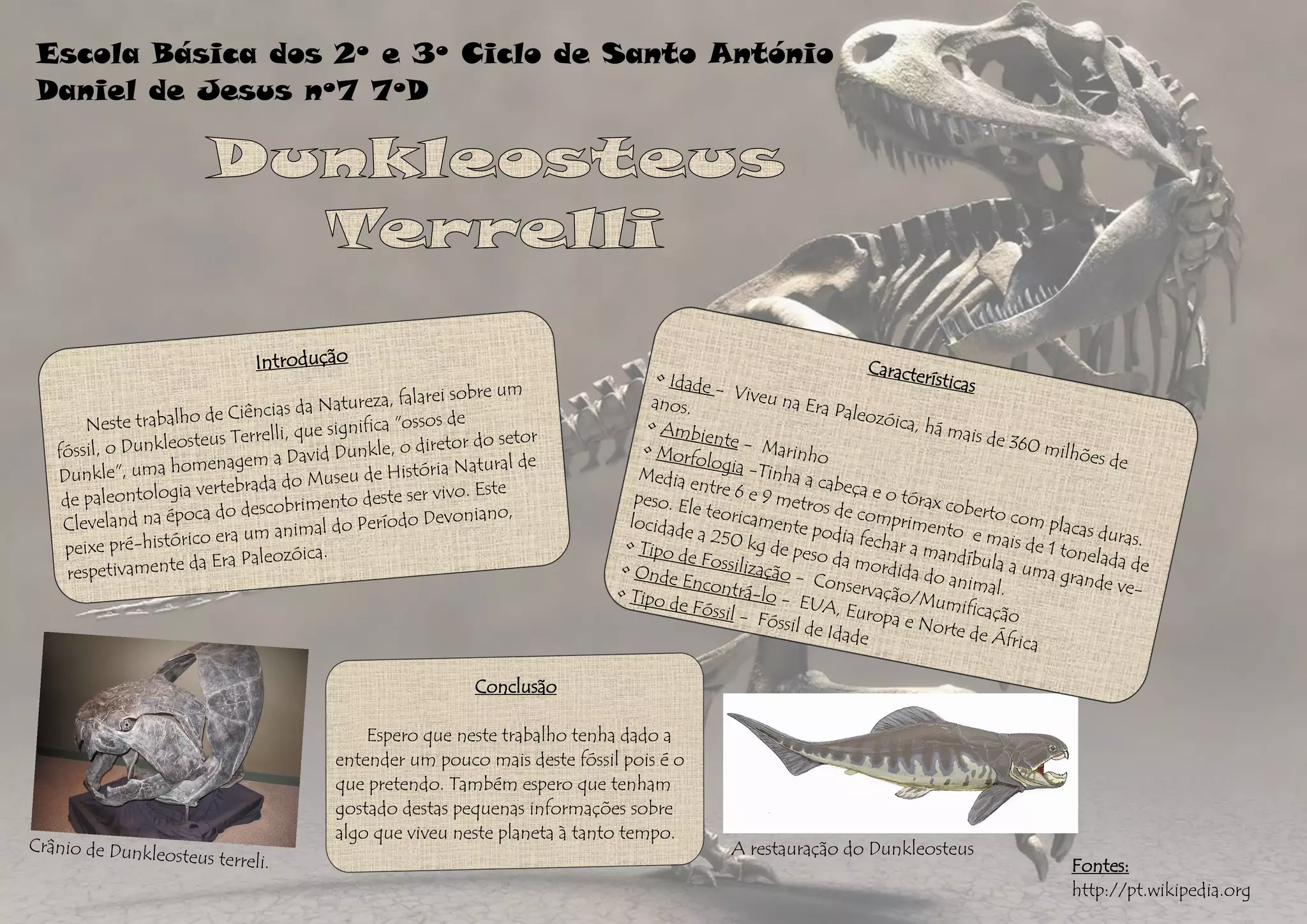 O documento descreve o Dunkleosteus terreli, um peixe pré-histórico da Era Paleozóica. O Dunkleosteus terreli media entre 6 a 9 metros de comprimento, pesava cerca de 1 tonelada e tinha uma mandíbula poderosa capaz de fechar com força suficiente para partir um osso. O fóssil deste peixe pré-histórico foi encontrado nos EUA, Europa e Norte de África.