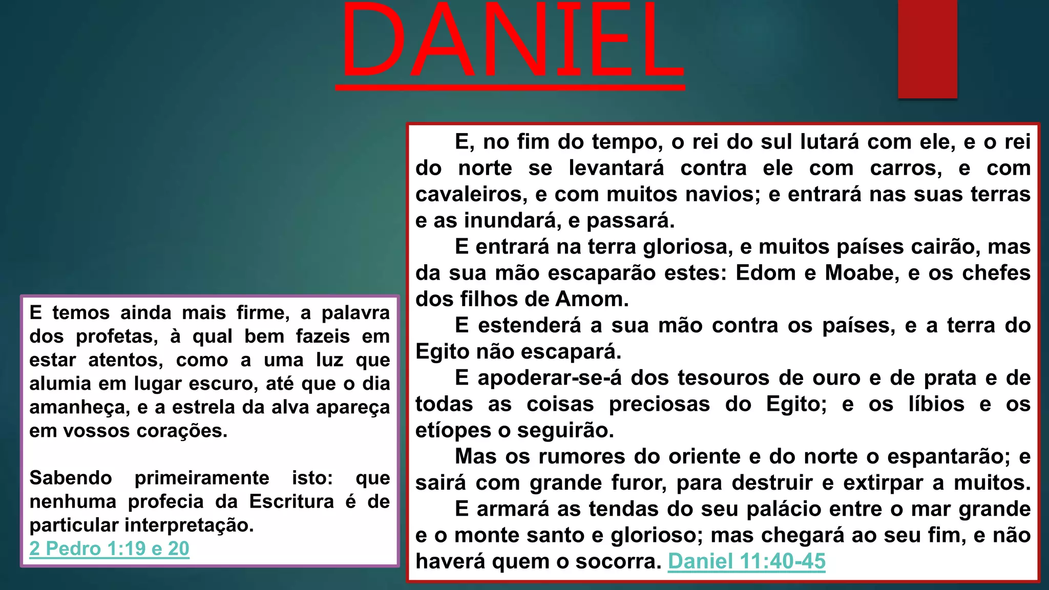O documento descreve uma profecia bíblica sobre um conflito futuro entre o rei do sul e o rei do norte, no qual o rei do norte invadirá as terras do rei do sul. O rei do norte também estenderá sua mão contra o Egito, tomando seus tesouros. No entanto, rumores do oriente e do norte o assustarão, levando-o a destruir muitos. Ele estabelecerá seu palácio entre o mar e o monte santo, mas chegará ao seu fim sem ajuda.