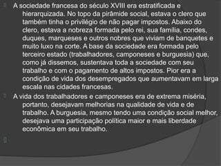 A sociedade francesa no século XVIII era extremamente desigual, levando ao grande descontentamento popular. A queda da Bastilha em 1789 marcou o início da Revolução Francesa, quando o povo francês buscou derrubar a monarquia e estabelecer os ideais de "Liberdade, Igualdade e Fraternidade". A revolução transformou a sociedade e política francesa, porém a burguesia acabou assumindo o controle e estabelecendo um governo capitalista sob Napoleão Bonaparte.