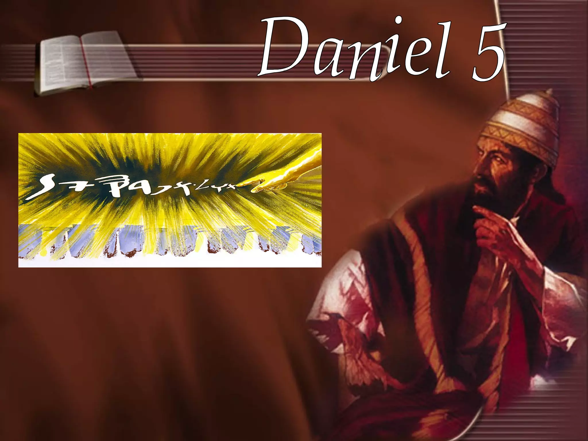 O capítulo descreve a queda de Babilônia após o rei Belsazar ofender Deus ao beber vinho nos vasos sagrados do templo de Jerusalém. Isso representa as falsas doutrinas se misturando com a verdade de Deus. Deuses misteriosamente escrevem uma mensagem na parede, anunciando o fim do reino de Babilônia e de quem se embebeda de suas doutrinas.