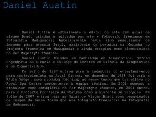 Daniel Austin é um fotógrafo freelancer e editor de guias de viagem. Ele estudou em várias universidades renomadas e trabalhou em várias posições, incluindo pesquisador de imagens, assistente de pesquisa e estagiário de teatro. Atualmente, ele usa equipamento Nikon para capturar suas fotografias de Madagascar.