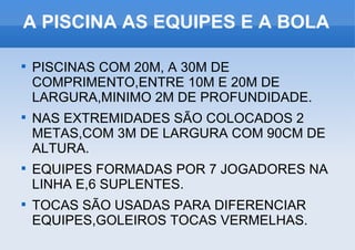 O polo aquático é um esporte coletivo praticado na água desde o século XVIII na Inglaterra e Escócia, tendo sido formalizado em 1870 em Londres. As partidas ocorrem em piscinas entre 20 a 30 metros com equipes de 7 jogadores que usam toucas para diferenciar times e tentam marcar gols com uma bola pesando entre 400 a 450 gramas.