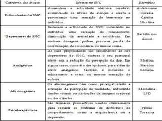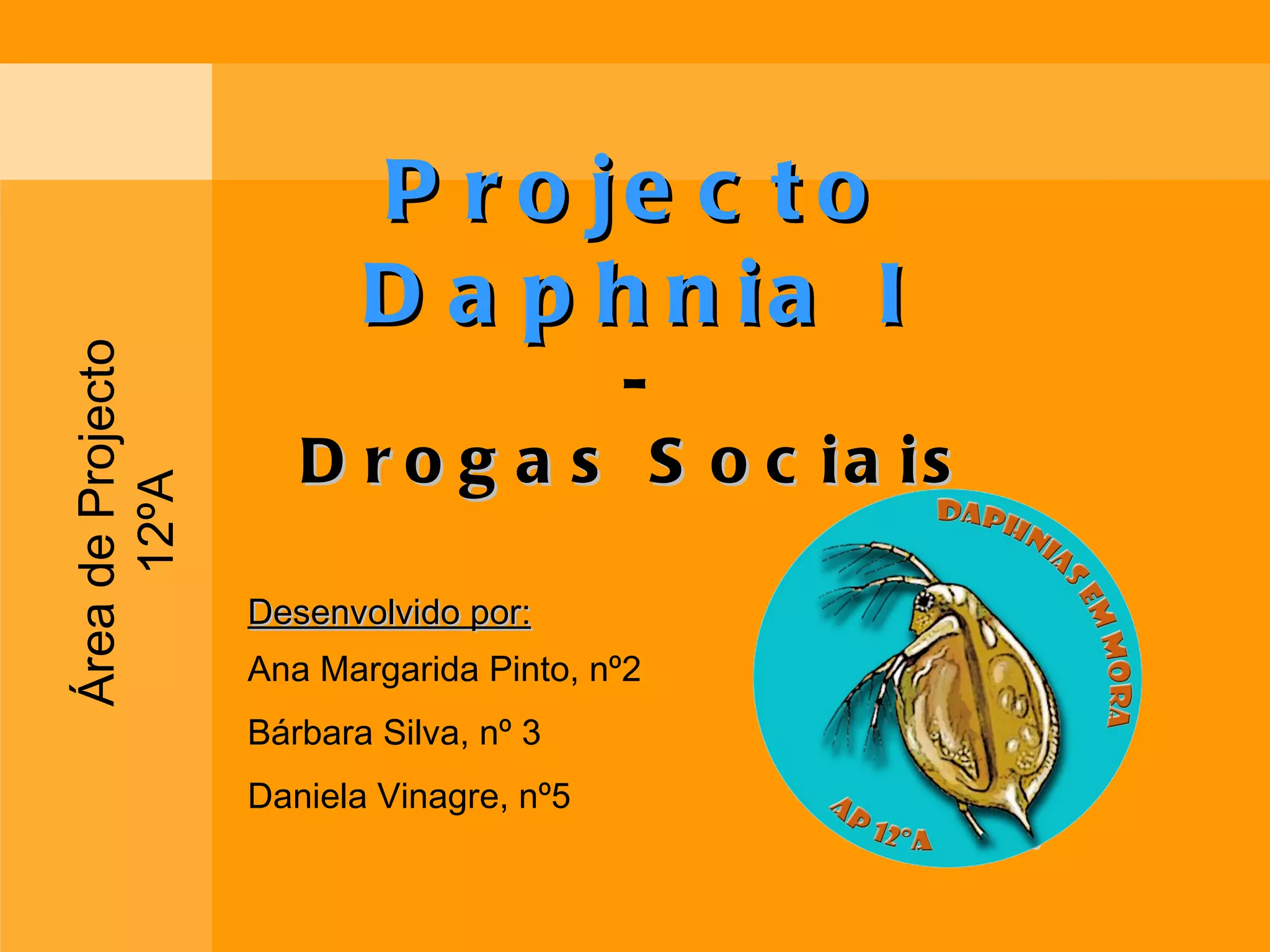 Este documento descreve um projeto de estudo das drogas cafeína, nicotina e álcool em Daphnias. O projeto testou os efeitos destas drogas no ritmo cardíaco das Daphnias e observou um aumento com a cafeína e diminuição com o álcool, relacionando os efeitos com os seres humanos. As conclusões indicam que a cafeína estimula o sistema nervoso e cardíaco, a nicotina tem efeitos estimulantes e depressivos, e o álcool reduz a frequência cardíaca.