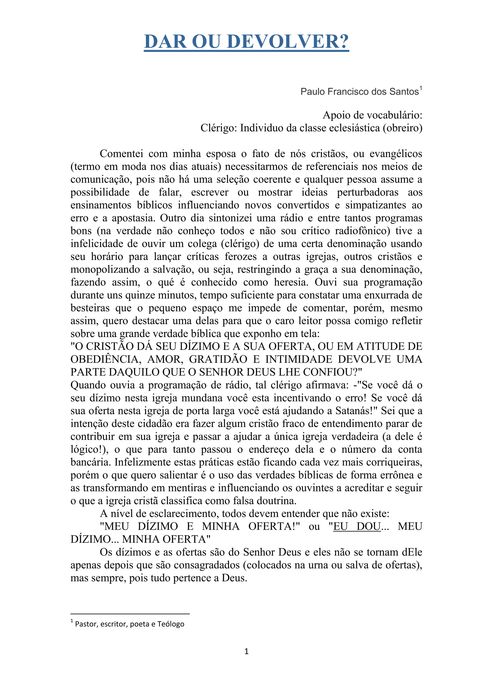 O documento discute a questão de dar ou devolver dizimos e ofertas. Ele argumenta que tudo pertence a Deus e que ao invés de dar, os cristãos devolvem uma parte do que Deus lhes confiou em atos de obediência, amor e gratidão. O autor critica quem usa as doutrinas bíblicas de forma errônea para influenciar os outros e defende que dizimos e ofertas são devolvidos a Deus.