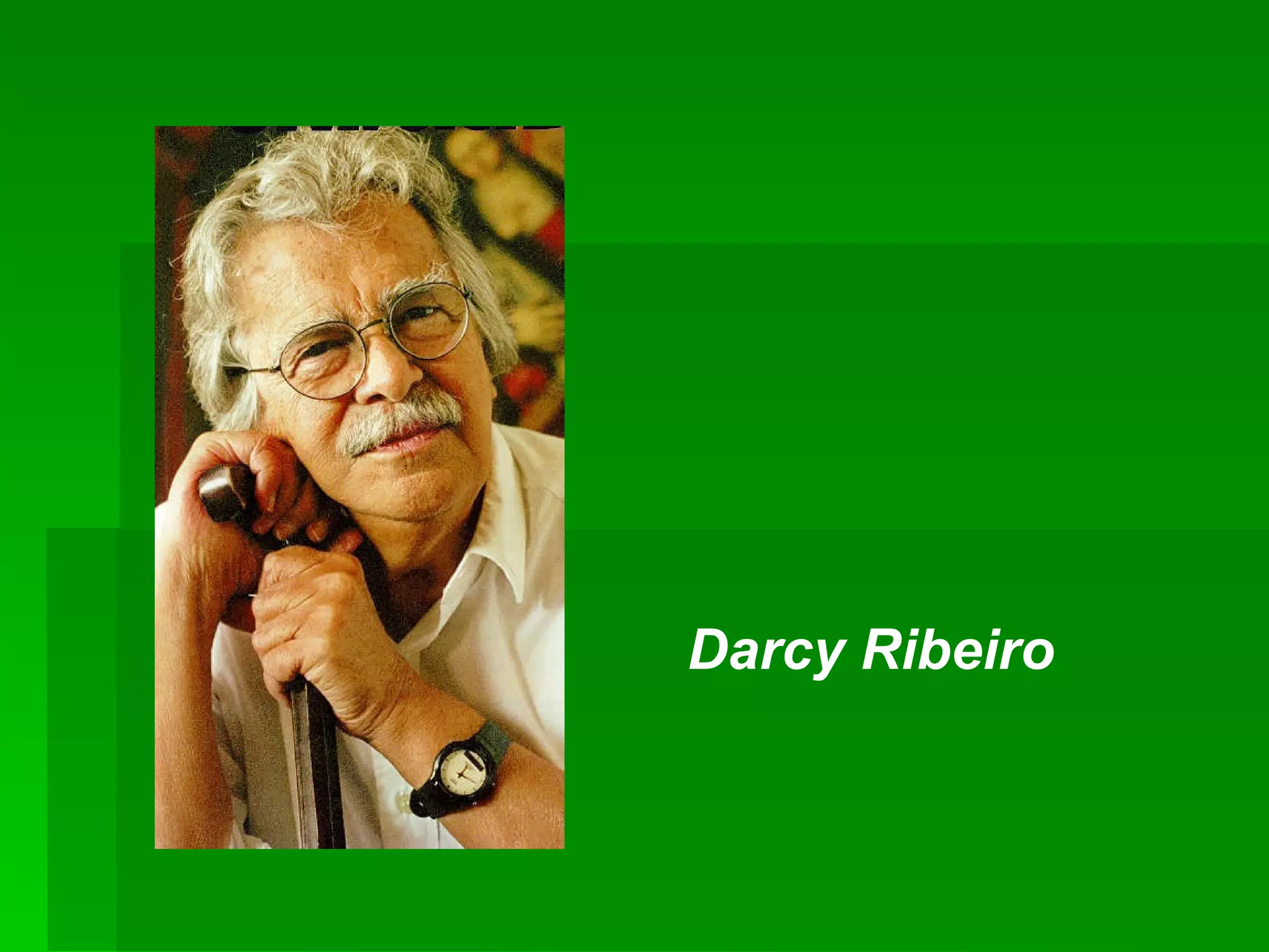Darcy Ribeiro foi um importante antropólogo e educador brasileiro, nascido em 1922, reconhecido por suas contribuições à defesa da causa indígena e à inovação no sistema educacional, destacando-se como fundador da Universidade de Brasília e do CIEP. Ele também abordou as desigualdades sociais e a necessidade de um desenvolvimento mais justo no Brasil, refletindo sobre suas frustrações e vitórias em projetos educacionais e sociais. Sua obra propõe uma reflexão sobre a identidade brasileira e a importância da educação para a formação de uma sociedade mais solidária.