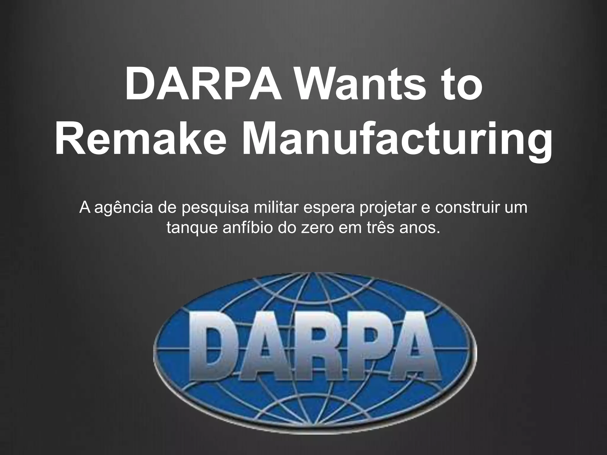 A DARPA pretende projetar e construir um tanque anfíbio em três anos através de um processo colaborativo e digital que permita aos designers prever como os componentes irão interagir antes da construção física, a fim de evitar problemas e acelerar o processo de fabricação.