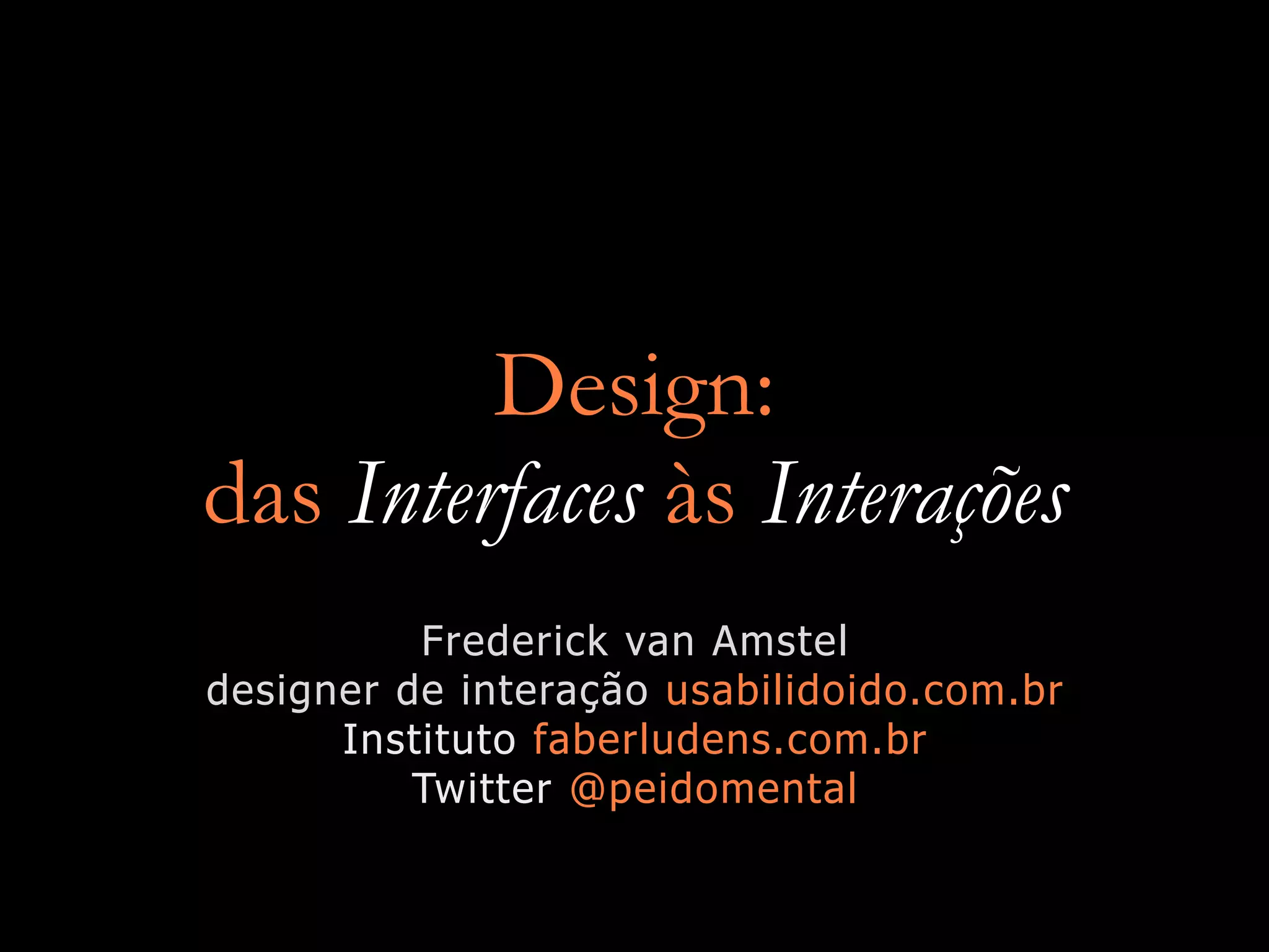 O documento discute o design de interfaces e interações, enfatizando que a experiência do usuário é o foco principal. A interação é poder, não a informação. O documento também aborda vigilância, disciplina e poder nas sociedades modernas, sugerindo que mudanças sociais se propagam através de redes e que devemos viver em sociedades alternativas.