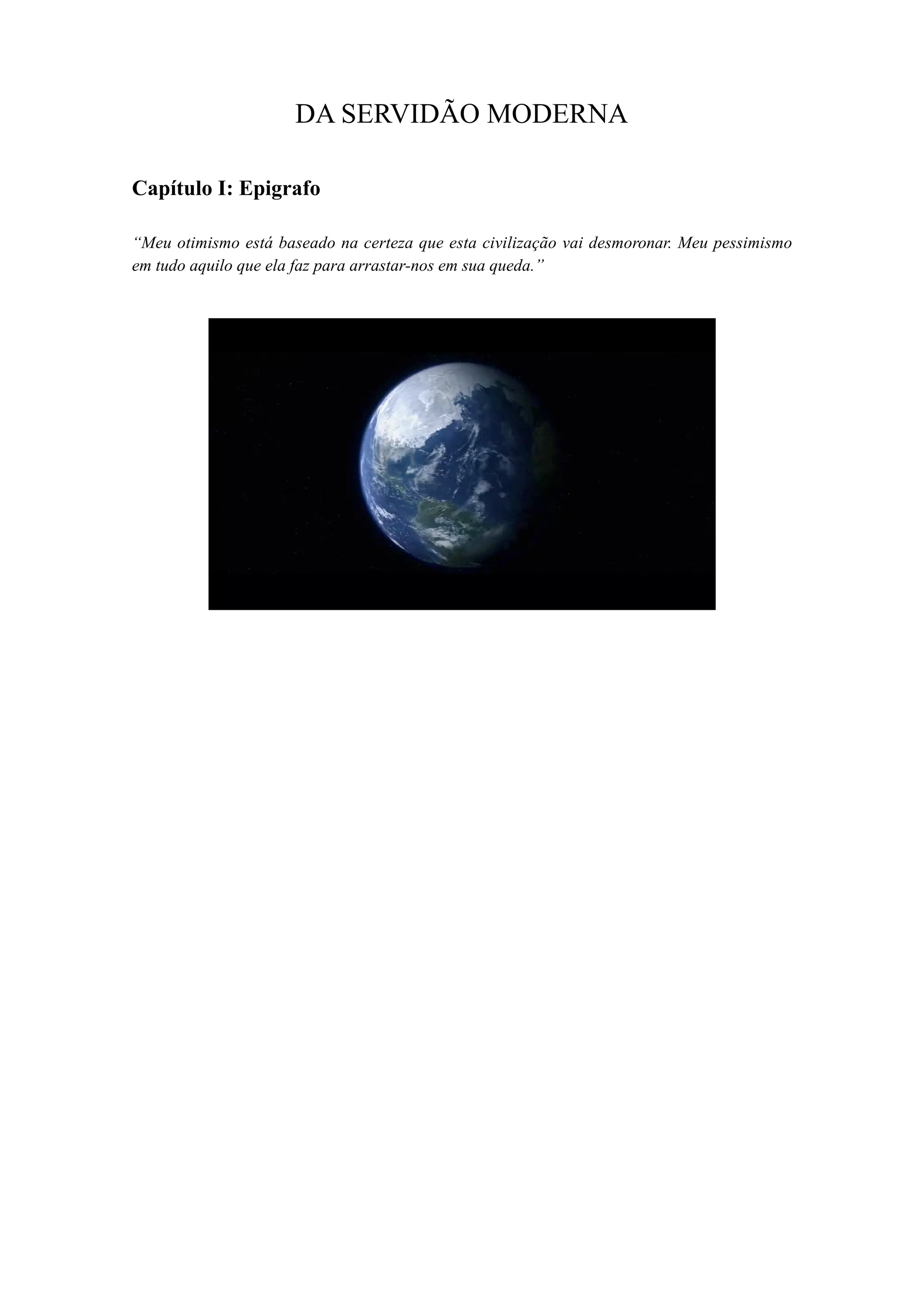 O documento descreve a condição de "servidão moderna" na qual vivem as massas sob o sistema capitalista atual. Os escravos modernos aceitam voluntariamente sua exploração e alienação, sem perceber que estão presos a uma vida desumanizante dedicada ao trabalho, consumo e obediência. O documento critica diversos aspectos dessa realidade, como a degradação do meio ambiente, a mercantilização total da vida e a medicalização dos sintomas sem atacar as causas reais da opressão.