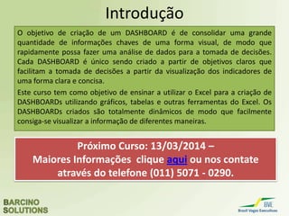 Este documento descreve um curso sobre a criação de dashboards no Excel para análise de dados e tomada de decisões. O curso ensina a usar gráficos, tabelas e funções do Excel para criar dashboards dinâmicos que podem visualizar informações de diferentes maneiras. O curso tem duração de 8 horas e é ministrado por um especialista com experiência em cursos corporativos.