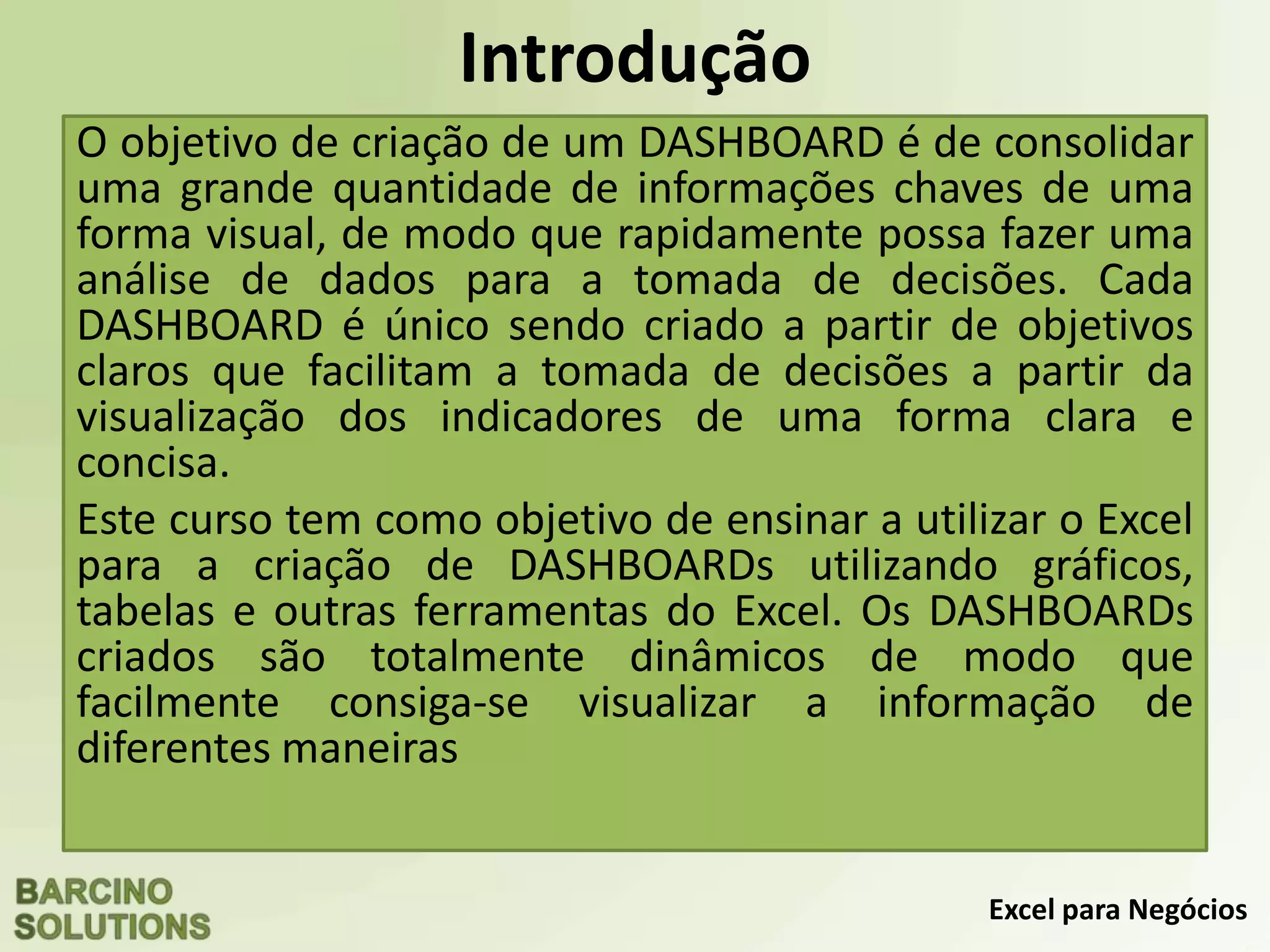 Este documento fornece um resumo de um curso sobre a criação de dashboards no Excel. O curso ensina como usar gráficos, tabelas e outras ferramentas do Excel para criar dashboards dinâmicos que permitem visualizar informações de diferentes maneiras. O curso é dividido em módulos que cobrem tópicos como design de dashboards, funções, gráficos dinâmicos e interfaces interativas. O documento também inclui exemplos de dashboards dinâmicos criados no Excel.