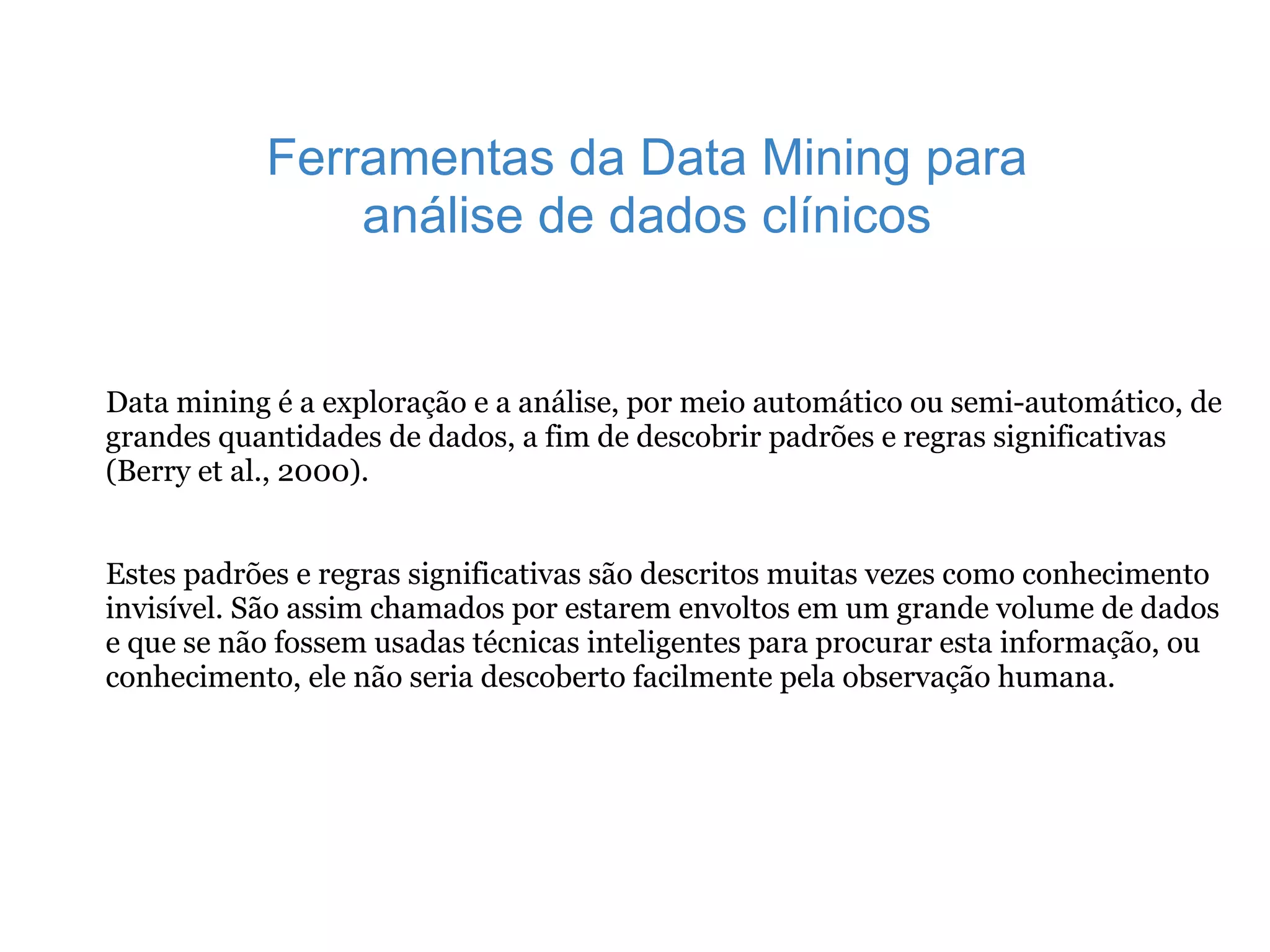 Data mining é a análise de grandes quantidades de dados para descobrir padrões e regras significativas. Estes padrões são chamados de conhecimento invisível e não seriam descobertos facilmente sem técnicas inteligentes. O processo de data mining usa conhecimentos de inteligência artificial e estatística para realizar a coleta e análise de dados.