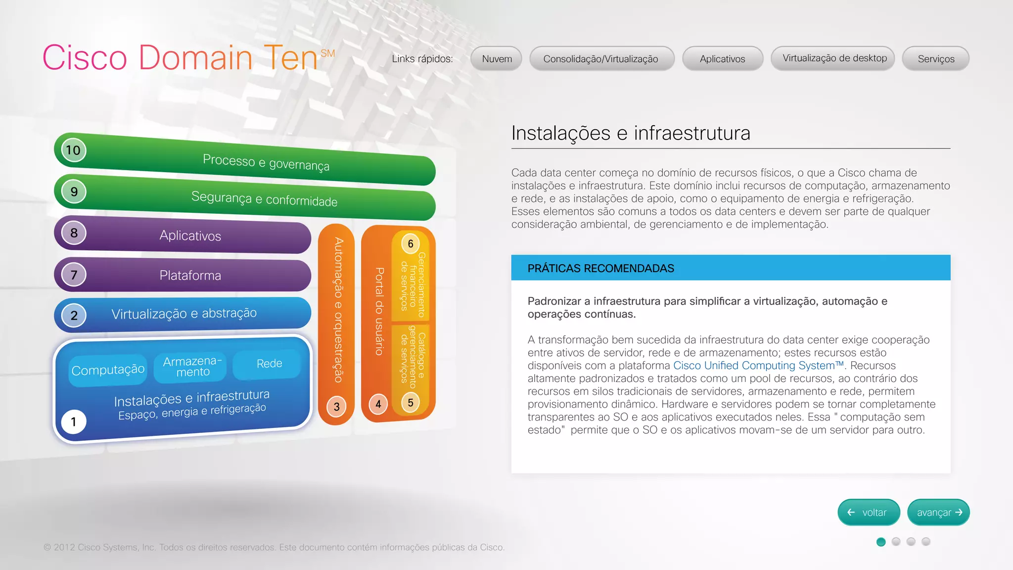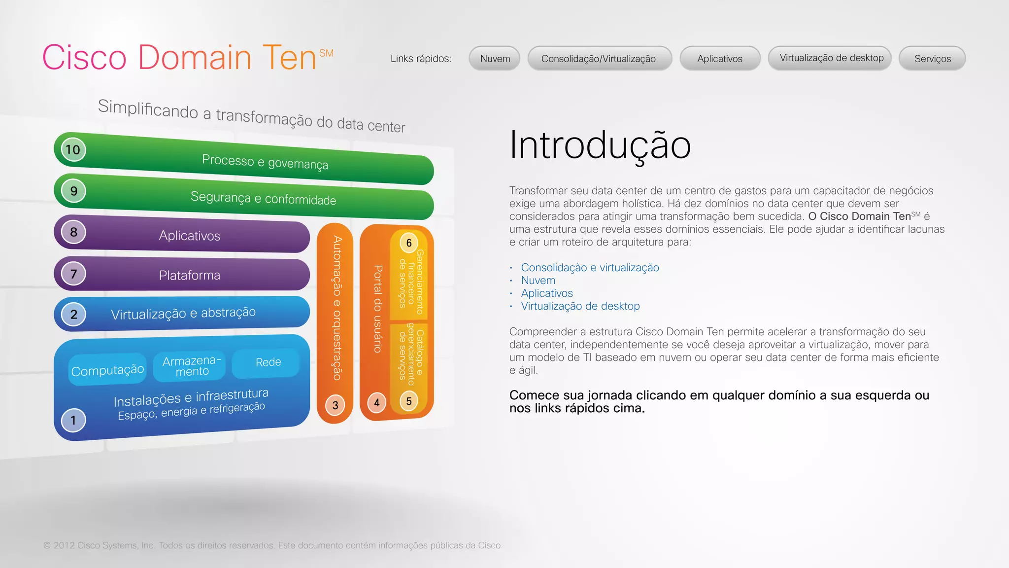 O documento discute a estrutura Cisco Domain Ten para transformar data centers. Os dez domínios incluem instalações e infraestrutura, virtualização e abstração, automação e orquestração, e portal do usuário. A estrutura pode ajudar a identificar lacunas e criar um roteiro de arquitetura para consolidação, nuvem e virtualização.