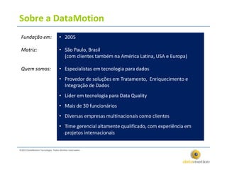 O documento descreve o produto DataMotion Deduper da empresa DataMotion Tecnologia, especializada em tratamento e integração de dados. O DataMotion Deduper é uma ferramenta para deduplicação e cruzamento de dados que pode processar grandes volumes de registros com alta customização. Ele permite definir chaves de correspondência, regras de comparação e gera relatórios de duplicados encontrados.