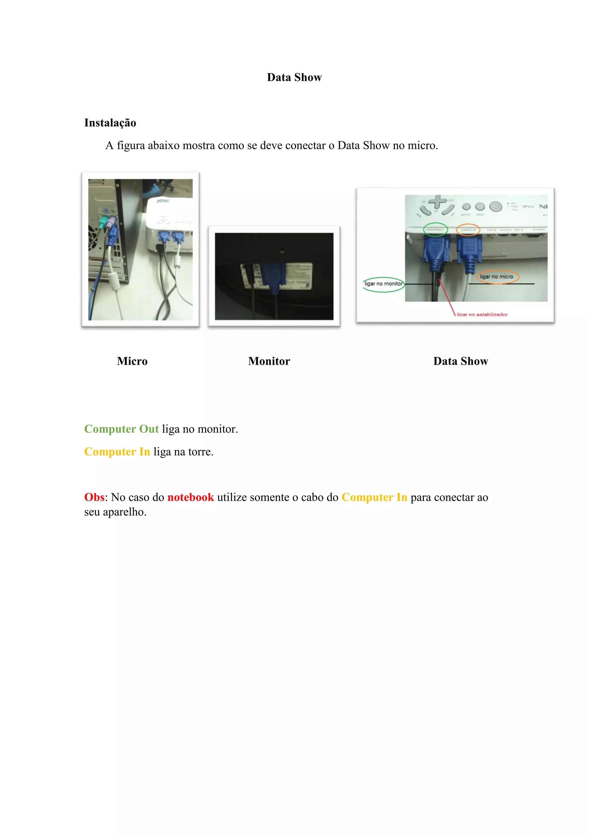 O Data Show permite conectar um computador a um monitor. Ele deve ser conectado com os cabos Computer Out no monitor e Computer In na torre do computador. Para notebooks, basta usar o cabo Computer In.